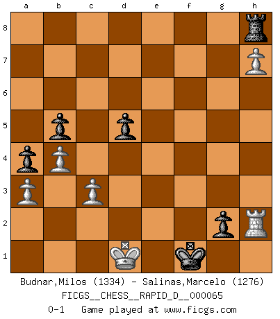 Last move : 0-1 2012 May 16 7:40:27 [Event "FICGS__CHESS__RAPID_D__000065"] [Site "FICGS"] [Date "2012.01.13"] [Round "1"] [White "Budnar,Milos"] [Black "Salinas,Marcelo"] [Result "0-1"] [WhiteElo "1334"] [BlackElo "1276"] 1.e4 d5 2.exd5 Qxd5 3.Nc3 Qe6 4.Qe2 Qg6 5.d3 Nc6 6.Be3 Qf5 7.O-O-O Be6 8.d4 Nb4 9.Qb5+ Qxb5 10.Bxb5+ c6 11.a3 Na2+ 12.Nxa2 Bxa2 13.Be2 Bd5 14.Bf3 Nf6 15.Bg5 Bxf3 16.Nxf3 Ng4 17.Be3 e6 18.h3 Nf6 19.Ne5 Rd8 20.Bg5 Be7 21.Rhe1 Nd5 22.Bxe7 Nxe7 23.Ng4 O-O 24.Ne3 Ng6 25.g3 b5 26.c3 h5 27.h4 a5 28.b4 a4 29.f4 Rd6 30.f5 Ne7 31.Re2 Nxf5 32.Nxf5 exf5 33.Re5 g6 34.d5 Rfd8 35.Re5e1 cxd5 36.Rd4 Re6 37.Red1 Re5 38.Rd4d3 f6 39.Rd1d2 Kf7 40.Kb2 Ke6 41.Kc2 g5 42.hxg5 fxg5 43.Rd4 Rh8 44.Rdh2 Re3 45.g4 f4 46.gxh5 f3 47.h6 Re2+ 48.Rd2 g4 49.Rdxe2 fxe2 50.Rxe2 Kf5 51.Rh2 Kf4 52.h7 Kf3 53.Kd2 g3 54.Rh3 Kf2 55.Kd1 g2 56.Rh2 Kf1 0-1 Scandinavian (centre counter) defense Queenside Castling by player White (move 7) Kingside Castling by player Black (move 23) Player Black won this chess game. Follow this game move after move (download)You must take your opponent into a deep dark forest where 2+2=5, and the path leading out is only wide enough for one. (Mikhail Tal) Auf Remis zu spielen ist gewissermaßen ein Verbrechen gegen das Schachspiel. (Mikhail Nekhemyevich Tal) Solo puedes ser bueno en el Ajedrez si amas al juego. (Bobby Fischer) Le pion, dans sa simplicité, marche droit devant lui, mais lorsqu'il prend, il le fait obliquement? Ainsi l'homme, tant qu'il reste pauvre, marche dans la droiture et vit honnêtement, mais lorsqu'il recherche les honneurs, il flatte, se parjure et, par les voies obliques, cherche une position supérieure sur l'échiquier du monde. (Jean de Galles) I take risks, sometimes patients die, but not taking risks causes more patients to die. So I guess my biggest problem is I've been cursed with the ability to do the math. (Gregory House, House M.D.)