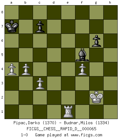 Last move : 1-0 2012 February 6 11:49:28 [Event "FICGS__CHESS__RAPID_D__000065"] [Site "FICGS"] [Date "2012.01.13"] [Round "1"] [White "Pipac,Darko"] [Black "Budnar,Milos"] [Result "1-0"] [WhiteElo "1370"] [BlackElo "1334"] 1.e4 e5 2.Nf3 Nc6 3.Bb5 f5 4.Bxc6 dxc6 5.exf5 Bxf5 6.Nxe5 Qe7 7.d4 O-O-O 8.O-O Nf6 9.Bg5 g6 10.Re1 Qg7 11.c3 h6 12.Bxf6 Qxf6 13.Nd2 Bd6 14.Ndf3 Bxe5 15.Nxe5 Rhe8 16.Qf3 h5 17.h3 c5 18.g4 hxg4 19.hxg4 Qg5 20.Nf7 Qxg4+ 21.Qxg4 Rxe1+ 22.Rxe1 Bxg4 23.Nxd8 Kxd8 24.dxc5 Kd7 25.Kg2 Kc6 26.b4 b6 27.cxb6 Kb7 28.bxa7 Kxa7 29.a4 Bf5 30.f4 1-0 Ruy Lopez : Schliemann defense Queenside Castling by player Black (move 7) Kingside Castling by player White (move 8) 10 pieces endgame at move 28 : White KRPPPP , Black KBPP WHITE : King + 1 Rook 4 Pawns BLACK : King + 1 Bishop 2 Pawns Player White won this chess game. Follow this game move after move (download)Without error there can be no brilliancy. (Emanuel Lasker) Sicherlich können nur Meister einen Stil haben. Daß ein nicht-Meister auch nur ein einziges Mal in seinem Leben eine Partie folgerecht durchführte, habe ich niemals bemerkt. (Emanuel Lasker) Un entendimiento a fondo de las continuaciones típicas del mate, hace de las combinaciones de sacrificio mas complicadas conducirlas a ellas no solo sin dificultad, sino casi de una manera natural. (Siegbert Tarrasch) Il (Jacob Murray) ne joue pas pour le bon coup, mais pour le meilleur. (Eloi Relange) Locking firmely the window serves nothing, only small thiefs pass through there, the big thiefs enter through the front door. (Luc-Olivier Leclerc)