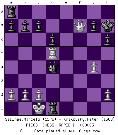 Last move : 0-1 2012 March 30 18:36:59 [Event "FICGS__CHESS__RAPID_D__000065"] [Site "FICGS"] [Date "2012.01.13"] [Round "1"] [White "Salinas,Marcelo"] [Black "Krakovsky,Peter"] [Result "0-1"] [WhiteElo "1276"] [BlackElo "1569"] 1.e4 e5 2.Nc3 Nf6 3.d4 exd4 4.Qxd4 Nc6 5.Qa4 Bc5 6.Be3 Bxe3 7.fxe3 d6 8.O-O-O O-O 9.Nf3 Ng4 10.Rd2 Nxe3 11.e5 Bg4 12.Qe4 Nxf1 13.Rxf1 Bxf3 14.Rxf3 Re8 15.Rd5 Nxe5 16.Rh3 h6 17.Rh5 Nd7 18.Qh4 Nf6 19.g4 Nxh5 20.Qxh5 Re1+ 21.Nd1 Qf6 22.Rf5 Qd4 23.Qxf7+ Kh7 24.Rd5 Rxd1+ 0-1 Vienna : Falkbeer variation Queenside Castling by player White (move 8) Kingside Castling by player Black (move 8) Player Black won this chess game. Follow this game move after move (download)Chess books should be used as we use glasses: to assist the sight, although some players make use of them as if they thought they conferred sight. (Jose Raul Capablanca) Wie bekannt hörte Morphy 1859 auf, Schach zu spielen. Seine Enttäuschung galt nicht so sehr dem Schach, wie den Schachspielern. (Robert James Fischer) ¿Porque tengo que perder ante este idiota?. (Aron Nimzovich) On croit qu'il y a plus de mauvais joueurs que de bons joueurs, c'est faux : Il y a autant de joueurs qui gagnent que de joueurs qui perdent. (Philippe Geluck) If you know the enemy and know yourself you need not fear the results of a hundred battles. (Sun Tzu)