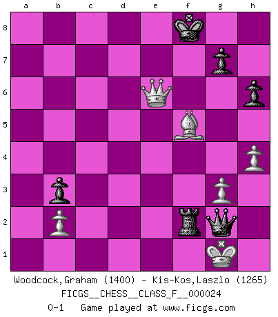 Last move : 0-1 2007 April 9 17:0:1 [Event "FICGS__CHESS__CLASS_F__000024"] [Site "FICGS"] [Date "2007.01.15"] [Round "1"] [White "Woodcock,Graham"] [Black "Kis-Kos,Laszlo"] [Result "0-1"] [WhiteElo "1400"] [BlackElo "1265"] 1.d4 d5 2.c4 e6 3.Nf3 Nf6 4.Bg5 Be7 5.Nc3 O-O 6.e3 h6 7.Bh4 b6 8.Bd3 dxc4 9.Bxc4 Bb7 10.Nb5 Nbd7 11.Bg3 c5 12.Bc7 Qc8 13.Bg3 Bxf3 14.Qxf3 cxd4 15.Rc1 dxe3 16.Qxe3 Bc5 17.Qd3 a6 18.Nc3 b5 19.Bb3 Rd8 20.O-O Ne5 21.Qe2 Ng6 22.Ne4 Nxe4 23.Qxe4 a5 24.a3 Ra6 25.Ba2 Rc6 26.Kh1 Rd2 27.Rc2 Rxc2 28.Qxc2 Bxa3 29.Qb1 Bd6 30.Bxd6 Rxd6 31.h3 a4 32.Qe4 Qb8 33.Bb1 b4 34.h4 f5 35.Qc2 b3 36.Qc4 Ne5 37.Qxa4 Ng4 38.g3 Rd2 39.Qc4 Nxf2+ 40.Rxf2 Rxf2 41.Qxe6+ Kf8 42.Bxf5 Qa8+ 43.Kg1 Qg2+ 0-1 QGD Kingside Castling by player Black (move 5) Kingside Castling by player White (move 20) Player Black won this chess game. Follow this game move after move (download)Chess is war over the board. The object is to crush the opponents mind. (Bobby Fischer) Stelle das Brett so, daß die Sonne in die Augen deines Gegners scheint. (Ruy López) Bendita sea la memoria de aquel que dio al mundo este juego inmortal. (A. G. Gardiner) On a dit que l'homme se distingue de l'animal par le fait qu'il achète plus de livres qu'il ne peut en lire. Je voudrais suggérer qu'inclure à la liste des livres quelques livres d'échecs rendrait la distinction manifeste. (Edward Lasker) To steal ideas from one person is plagiarism. To steal from many is research. (Unknown)