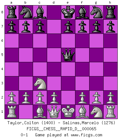 Last move : 0-1 2012 February 21 19:50:8 [Event "FICGS__CHESS__RAPID_D__000065"] [Site "FICGS"] [Date "2012.01.13"] [Round "1"] [White "Taylor,Colton"] [Black "Salinas,Marcelo"] [Result "0-1"] [WhiteElo "1400"] [BlackElo "1276"] 1.e4 d5 2.exd5 Qxd5 3.Nc3 Qe5 0-1 This chess game has been lost on time (started : 2012.01.13 14:56:30) Scandinavian (centre counter) defense Player Black won this chess game. Follow this game move after move (download)Mistrust is the most necessary characteristic of the Chess player. (Siegbert Tarrasch) Ich kenne keine einzige Person, die behaupten würde, Garri Kasparow sei ein guter Mensch (Nigel Short) El Ajedrez es en su esencia, un juego. En su forma, un arte. Y en su ejecución, una ciencia. (Baron Tassilo) Dieu déplace le joueur, et celui-ci la pièce. Quel Dieu derrière Dieu commence donc la trame ? Arturo Perez-Reverte (prix de littérature policière 1993). You have to believe in yourself. (Sun Tzu)