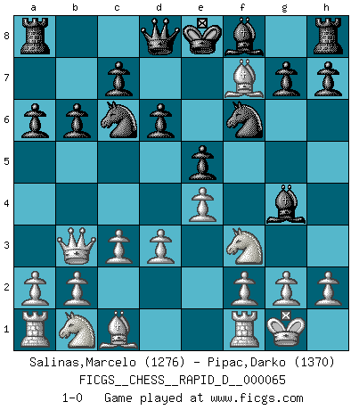 Last move : 1-0 2012 February 3 18:50:18 [Event "FICGS__CHESS__RAPID_D__000065"] [Site "FICGS"] [Date "2012.01.13"] [Round "1"] [White "Salinas,Marcelo"] [Black "Pipac,Darko"] [Result "1-0"] [WhiteElo "1276"] [BlackElo "1370"] 1.e4 e5 2.Nf3 Nc6 3.Bb5 d6 4.O-O Bd7 5.c3 a6 6.Bc4 Bg4 7.d3 Nf6 8.Qb3 b6 9.Bxf7+ 1-0 Ruy Lopez : Old Steinitz defense Kingside Castling by player White (move 4) Player White won this chess game. Follow this game move after move (download)After a bad opening, there is hope for the middle game. After a bad middle game, there is hope for the endgame. But once you are in the endgame, the moment of truth has arrived. (Edmar Mednis) Gewinnen beim Schach fördert das Selbstvertrauen. Beim Sex spüre ich sowas nicht... (Garry Kasparov) Un jugador que trata de regresar una movida en el Ajedrez es un futuro carterista. (Richard Fenton) Le thème de l'attaque double intervient d'une manière ou d'une autre dans l'immense majorité des combinaisons. (Youri Averbakh) Unless in communicating with it one says exactly what one means, trouble is bound to result. (Alan Turing, about computers)