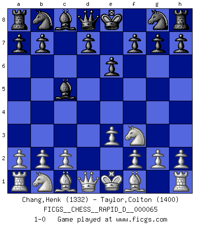 Last move : 1-0 2012 February 17 7:45:34 [Event "FICGS__CHESS__RAPID_D__000065"] [Site "FICGS"] [Date "2012.01.13"] [Round "1"] [White "Chang,Henk"] [Black "Taylor,Colton"] [Result "1-0"] [WhiteElo "1332"] [BlackElo "1400"] 1.d4 c5 2.dxc5 e6 3.e3 Bxc5 4.Nf3 1-0 This chess game has been lost on time (started : 2012.01.13 14:56:30) Old Benoni defense Player White won this chess game. Follow this game move after move (download)The most powerful weapon in Chess is to have the next move. (David Bronstein) Nach Morphy wurde nichts neues mehr in der Behandlung offener Positionen gefunden. (Mikhail Moiseyevich Botvinik) No hay precio que sea tan grande por la cabellera del Rey enemigo. (Koblentz) Il s'avisa de me proposer d'apprendre les échecs qu'il jouait un peu... me voilà forcené des échecs. J'achète un échiquier, je m'enferme dans ma chambre, j'y passe des jours et des nuits à vouloir apprendre par cur toutes les parties. (Jean-Jacques Rousseau, Confessions) Programming can only do so much before it becomes too much. (Don Groves)
