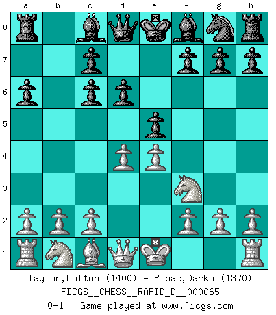 Last move : 0-1 2012 February 18 19:45:51 [Event "FICGS__CHESS__RAPID_D__000065"] [Site "FICGS"] [Date "2012.01.13"] [Round "1"] [White "Taylor,Colton"] [Black "Pipac,Darko"] [Result "0-1"] [WhiteElo "1400"] [BlackElo "1370"] 1.e4 e5 2.Nf3 Nc6 3.Bb5 d6 4.d4 a6 5.Bxc6+ bxc6 0-1 This chess game has been lost on time (started : 2012.01.13 14:56:30) Ruy Lopez : Old Steinitz defense Player Black won this chess game. Follow this game move after move (download)First-class players lose to second class players because second-class players sometimes play a first-class game. (Tarrasch) Ich bin Weltmeister und muß mit niemandem irgend etwas diskutieren. (Viswanathan Anand) Repentinamente, me resultaba obvio en mi analisis que yo había pasado por alto lo que Fischer había visto en el tablero con la mas grande facilidad. (Mikhail Botvinnik) Les Echecs sont affaire de jugement sensible. Savoir quand frapper et quand esquiver. (Fischer) My poor ole parrot... Is not in the circulation of displays ....poo hoo hoo :) (Wayne Lowrance's enigma)
