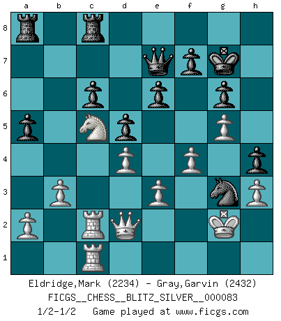 Last move : 1/2-1/2 2012 January 14 1:2:34 [Event "FICGS__CHESS__BLITZ_SILVER__000083"] [Site "FICGS"] [Date "2012.01.13"] [Round "1"] [White "Eldridge,Mark"] [Black "Gray,Garvin"] [Result "1/2-1/2"] [WhiteElo "2234"] [BlackElo "2432"] 1.b3 d5 2.Bb2 Nf6 3.e3 c5 4.f4 Nc6 5.Nf3 g6 6.Nc3 Bg7 7.Bb5 O-O 8.Bxc6 bxc6 9.Na4 c4 10.O-O Bg4 11.d3 Qd6 12.h3 Bxf3 13.Qxf3 cxd3 14.cxd3 Nd7 15.Bxg7 Kxg7 16.Rac1 Rab8 17.d4 Rb5 18.Rf2 e6 19.Rfc2 Rc8 20.Qf1 Ra5 21.Nb2 Nf6 22.Nd3 Rb5 23.Nc5 Qe7 24.Qe2 Qd6 25.Kh2 a5 26.g4 h6 27.Qf2 h5 28.g5 Ng8 29.Nd3 Ne7 30.Rc5 Qd7 31.Qd2 Nf5 32.Ne5 Qb7 33.R5c2 Rb6 34.Nd3 Ra8 35.Kg1 h4 36.Kh2 Ng3 37.Nc5 Qe7 38.Kg1 Qc7 39.Qc3 R6b8 40.Qd3 Rc8 41.Qd2 Qe7 42.Kg2 1/2-1/2 Nimzovich-Larsen attack : Classical variation Kingside Castling by player Black (move 7) Kingside Castling by player White (move 10) This chess game ended in a draw. Follow this game move after move (download)Chess demands total concentration. (Bobby Fischer) Offener Brief an US-Präsident Bush anlässlich der Verhaftung Bobby Fishers: Verhaften Sie mich. Stecken Sie mich in dieselbe Zelle wie Bobby Fisher und geben Sie uns ein Schachspiel mit. (Boris Vassilievich Spassky) Fischer no está bajo la obligación de nadie. (Joseph Platz) Les échecs, c'est la lutte contre l'erreur. (Johannes Zukertort) Horse racing is animated roulette. (Roger Kahn)