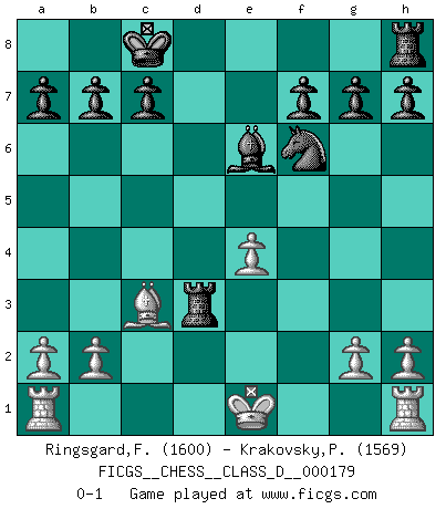 Last move : 0-1 2012 May 3 0:45:32 [Event "FICGS__CHESS__CLASS_D__000179"] [Site "FICGS"] [Date "2012.01.14"] [Round "1"] [White "Ringsgard,Fredrik Hasle"] [Black "Krakovsky,Peter"] [Result "0-1"] [WhiteElo "1600"] [BlackElo "1569"] 1.e4 e5 2.Nf3 Nc6 3.d4 exd4 4.Nxd4 Nf6 5.f3 Bc5 6.c3 d5 7.Qd3 dxe4 8.fxe4 Nxd4 9.cxd4 Qxd4 10.Qxd4 Bxd4 11.Bd3 Be6 12.Nc3 O-O-O 13.Bd2 Bxc3 14.Bxc3 Rxd3 0-1 Scotch : Schmidt variation Queenside Castling by player Black (move 12) Player Black won this chess game. Follow this game move after move (download)Chess is above all, a fight ! (Emanuel Lasker) Ein Kibitz ist einer, der deinem Gegner gute Ratschläge gibt. (Andrew Soltis) Durante una competencia de Ajedrez, un Maestro de Ajedrez deberá ser una combinación de presa de caza y un Monge. (Alexander Alekhine) Ce qui caractérise les parties de combat, c'est que si le défenseur a constamment de difficiles problèmes à résoudre, l'attaquant doit chercher sans relâche de nouvelles possibilités d'attaque. (Koblentz) The project of the man are lower than those of the sky. (Chinese proverb)