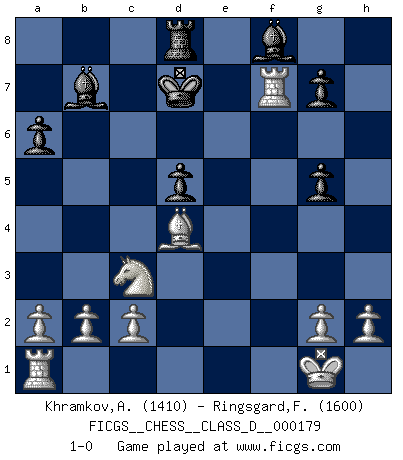 Last move : 1-0 2012 April 24 0:7:18 [Event "FICGS__CHESS__CLASS_D__000179"] [Site "FICGS"] [Date "2012.01.14"] [Round "1"] [White "Khramkov,Alexey"] [Black "Ringsgard,Fredrik Hasle"] [Result "1-0"] [WhiteElo "1410"] [BlackElo "1600"] 1.e4 e5 2.Nc3 Nf6 3.Nf3 Nc6 4.Bb5 a6 5.Bxc6 bxc6 6.Nxe5 Qe7 7.f4 Bb7 8.d3 d5 9.O-O O-O-O 10.exd5 cxd5 11.d4 c5 12.Be3 cxd4 13.Bxd4 Nh5 14.Qxh5 f6 15.Ng6 hxg6 16.Qxh8 g5 17.Qh3+ Qd7 18.Qxd7+ Kxd7 19.fxg5 fxg5 20.Rf7+ 1-0 This chess game has been lost on time (started : 2012.01.14 19:54:13) Vienna : Falkbeer variation Kingside Castling by player White (move 9) Queenside Castling by player Black (move 9) Player White won this chess game. Follow this game move after move (download)Up to this point White has been following well-known analysis. But now he makes a fatal error: he begins to use his own head. (Siegbert Tarrasch) Es gibt Leute, die glauben, alles wäre vernünftig, was man mit einem ernsthaften Gesicht tut. (Georg Christoph Lichtenberg) El Ajedrez es un regaderazo frío para la mente. (Sir John Simon) Même un GMI sait rarement calculer sur plus de cinq coups une attaque à sacrifices. (Rudolf Spielmann) This is where the fun begins. (Anakin Skywalker in Star Wars ep.3)