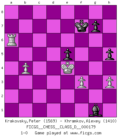 Last move : 1-0 2012 April 13 14:54:36 [Event "FICGS__CHESS__CLASS_D__000179"] [Site "FICGS"] [Date "2012.01.14"] [Round "1"] [White "Krakovsky,Peter"] [Black "Khramkov,Alexey"] [Result "1-0"] [WhiteElo "1569"] [BlackElo "1410"] 1.e4 Nc6 2.d4 d5 3.Nc3 dxe4 4.d5 Ne5 5.Qd4 Ng6 6.Qxe4 Nf6 7.Qa4+ Bd7 8.Bb5 a6 9.Bxd7+ Qxd7 10.Qxd7+ Nxd7 11.Nf3 h6 12.Be3 Nge5 13.Nxe5 Nxe5 14.O-O-O O-O-O 15.Rhe1 Ng4 16.Bc5 Rd7 17.f3 Nf6 18.a4 b6 19.Bb4 Kb7 20.a5 bxa5 21.Bxa5 c6 22.dxc6+ Kxc6 23.Rxd7 Nxd7 24.Re4 e5 25.Rc4+ Kd6 26.Ne4+ Kd5 27.Rc8 f5 28.c4+ Ke6 29.c5 fxe4 30.c6 exf3 31.gxf3 Bb4 32.cxd7 Kxd7 33.Rxh8 Bxa5 34.Ra8 Ke7 35.Ra7+ Kf8 36.Kc2 Bb4 37.Rxa6 Kf7 38.Kd3 Bc5 39.Ke4 Bg1 40.b4 h5 41.h3 1-0 KP : Nimzovich defense, Bogolyubov variation Queenside Castling by player White (move 14) Queenside Castling by player Black (move 14) 10 pieces endgame at move 37 : White KRPPP , Black KBPPP WHITE : King + 1 Rook 3 Pawns BLACK : King + 1 Bishop 3 Pawns Player White won this chess game. Follow this game move after move (download)Live, lose, and learn, by observing your opponent how to win. (Amber Steenbock) Wie ich sie so einen nach dem anderen nieder mähte wurde meine Überlegenheit offensichtlich. (José Raúl Capablanca) Vive, pierde y aprende al observar a tu oponente como ganar. (Amber Steenbock) Il vaut mieux sacrifier les pièces de l'adversaire. (Xavier Tartacover) If passion drives you, let reason holds the reins. (Benjamin Franklin)