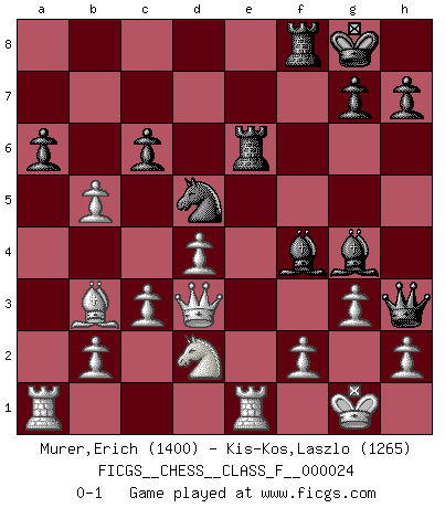 Last move : 0-1 2007 May 5 19:56:47 [Event "FICGS__CHESS__CLASS_F__000024"] [Site "FICGS"] [Date "2007.01.15"] [Round "1"] [White "Murer,Erich"] [Black "Kis-Kos,Laszlo"] [Result "0-1"] [WhiteElo "1400"] [BlackElo "1265"] 1.e4 e5 2.Nf3 Nc6 3.Bb5 a6 4.Ba4 Nf6 5.O-O Be7 6.Re1 b5 7.Bb3 O-O 8.c3 d5 9.exd5 Nxd5 10.Nxe5 Nxe5 11.Rxe5 c6 12.d4 Bd6 13.Re1 Qh4 14.g3 Qh3 15.Be3 Bg4 16.Qd3 Rae8 17.Nd2 Re6 18.a4 f5 19.axb5 f4 20.Bxf4 Bxf4 0-1 Ruy Lopez : Closed, 7...O-O Kingside Castling by player White (move 5) Kingside Castling by player Black (move 7) Player Black won this chess game. Follow this game move after move (download)I have added these principles to the law: get the Knights into action before both Bishops are developed. (Emanuel Lasker) Schach ist eine Sache der genauen Beurteilung, wann man zuschlagen und wann man sich ducken muss. (Robert James Fischer) Robert Fischer es la ley hacia si mismo. (Larry Evans) Aux échecs, l'amour-propre est satisfait quand on remporte la victoire, mais il n'y a pas de honte à être battu. (Benjamin Franklin) Wikichess, chess moves explained by 'experimented' players. (Thibault de Vassal)