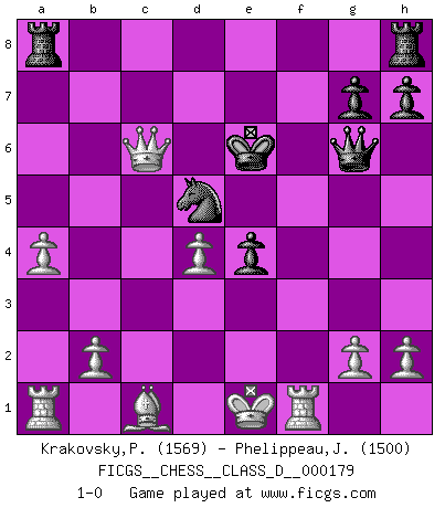 Last move : 1-0 2012 May 3 21:47:1 [Event "FICGS__CHESS__CLASS_D__000179"] [Site "FICGS"] [Date "2012.01.14"] [Round "1"] [White "Krakovsky,Peter"] [Black "Phelippeau,Jacques"] [Result "1-0"] [WhiteElo "1569"] [BlackElo "1500"] 1.e4 e5 2.Nf3 Nc6 3.Bb5 f5 4.Nc3 fxe4 5.Nxe4 d5 6.Nxe5 dxe4 7.Nxc6 Qg5 8.Qe2 Nf6 9.Nxa7 Bd7 10.Bxd7+ Nxd7 11.f4 Qxf4 12.d4 Qf5 13.Nb5 Bd6 14.Rf1 Qg6 15.Nxd6+ cxd6 16.a4 Nf6 17.Qb5+ Ke7 18.Qxb7+ Ke6 19.c4 d5 20.cxd5+ Nxd5 21.Qc6+ 1-0 Ruy Lopez : Schliemann defense, Berger variation Player White won this chess game. Follow this game move after move (download)No other master has such a terrific will to win. At the board he radiates danger, and even the strongest opponents tend to freeze, like rabbits when they smell a panther. Even his weaknesses are dangerous. As white, his opening game is predictable - you can make plans against it - but so strong that your plans almost never work. In the middle game his precision and invention are fabulous, and in the end game you simply cannot beat him. (Anonymous German Expert) Sitze auf Deine Hände. (Siegbert Tarrasch) El Ajedrez es en su esencia, un juego. En su forma, un arte. Y en su ejecución, una ciencia. (Baron Tassilo) Les échecs sont un jeu terrible. Si vous n'avez pas le centre, votre adversaire a une position plus libre. Par contre, si vous avez le centre, alors vous avez vraiment quelque chose pour laquelle vous inquiéter ! (Siegbert Tarrasch) Yoga is 99% practice and 1% knowledge. (Sri Krishna Pattabhi Jois)