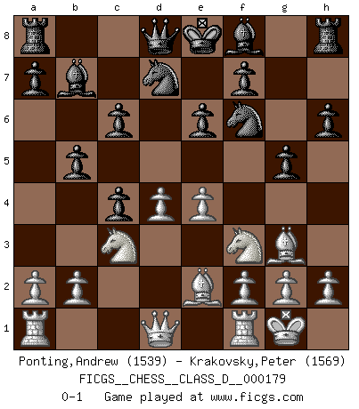Last move : 0-1 2012 April 30 0:32:39 [Event "FICGS__CHESS__CLASS_D__000179"] [Site "FICGS"] [Date "2012.01.14"] [Round "1"] [White "Ponting,Andrew"] [Black "Krakovsky,Peter"] [Result "0-1"] [WhiteElo "1539"] [BlackElo "1569"] 1.d4 d5 2.c4 c6 3.Nf3 Nf6 4.Nc3 e6 5.Bg5 h6 6.Bh4 dxc4 7.e4 g5 8.Bg3 b5 9.Be2 Bb7 10.O-O Nbd7 0-1 This chess game has been lost on time (started : 2012.01.14 19:54:13) QGD Slav : 4.Nc3 Kingside Castling by player White (move 10) Player Black won this chess game. Follow this game move after move (download)We like to think. (Gary Kasparov) Im Blitz ist es einfacher mit einer Figur weniger anzugreifen, als sich mit einer Mehrfigur zu verteidigen. (Mikhail Nekhemyevich Tal) Las Aperturas te enseñan aperturas. ¡Los Finales te enseñan Ajedrez!. (Stephan Gerzadowicz) Le plus grand jeu de l'esprit jamais inventé, plus vous l'apprenez, plus vous y prenez du plaisir. (Garry Kasparov) You can only get smarter by playing a smarter opponent. (Revolver, movie)