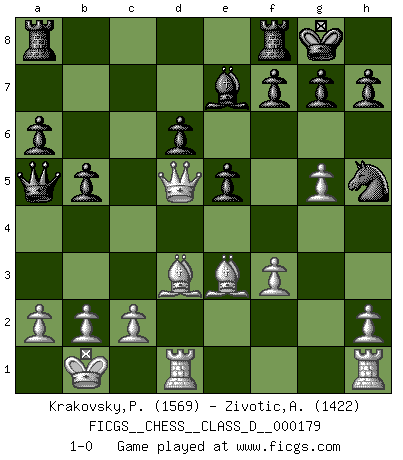Last move : 1-0 2012 April 30 12:36:57 [Event "FICGS__CHESS__CLASS_D__000179"] [Site "FICGS"] [Date "2012.01.14"] [Round "1"] [White "Krakovsky,Peter"] [Black "Zivotic,Aleksandar"] [Result "1-0"] [WhiteElo "1569"] [BlackElo "1422"] 1.e4 c5 2.Nf3 d6 3.d4 cxd4 4.Nxd4 Nf6 5.Nc3 a6 6.Be3 e5 7.Nb3 Be6 8.f3 Be7 9.Qd2 O-O 10.O-O-O Nbd7 11.g4 b5 12.g5 Nh5 13.Kb1 Qc7 14.Nd5 Bxd5 15.exd5 Nb6 16.Na5 Nxd5 17.Qxd5 Qxa5 18.Bd3 1-0 Sicilian : Najdorf, Byrne (English) attack Kingside Castling by player Black (move 9) Queenside Castling by player White (move 10) Player White won this chess game. Follow this game move after move (download)By playing at Chess then, we may learn: First: Foresight... Second: Circumspection... Third: Caution... And lastly, we learn by Chess the habit of not being discouraged by present bad appearances in the state of our affairs, the habit of hoping for a favorable chance, and that of persevering in the secrets of resources. (Benjamin Franklin) Ich hatte Zahnschmerzen im ersten Spiel. In der zweiten Partie tat mir der Kopf weh. In der dritten war es eine Rheuma-Attacke und während der vierten fühlte ich mich nicht gut. Und in der fünften? Nun, man muss doch nicht jedes Spiel gewinnen, oder? (Savielly Grigorievitsch Tartakower) El Ajedrez es un cuento de Hadas de las 1001 metidas de pata. (Savielly Tartakower) Si je n'étais pas joueur d'échecs, je serais le meilleur dans quelque chose d'autre. (Anatoli Karpov) Ah, the Socrating method. The best way we have of teaching everything-apart from juggling chainsaws. (Gregory House, House M.D.)