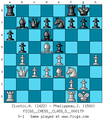 Last move : 0-1 2012 April 18 23:46:27 [Event "FICGS__CHESS__CLASS_D__000179"] [Site "FICGS"] [Date "2012.01.14"] [Round "1"] [White "Zivotic,Aleksandar"] [Black "Phelippeau,Jacques"] [Result "0-1"] [WhiteElo "1422"] [BlackElo "1500"] 1.e4 e5 2.Nf3 Nc6 3.Bc4 Nf6 4.Nc3 Bb4 5.O-O O-O 6.d3 Na5 7.Nd5 Nxd5 8.Bxd5 c6 9.a3 Bd6 10.Ba2 c5 11.c3 Nc6 12.b4 cxb4 13.axb4 b5 14.Be3 Bb7 15.Bd5 a6 16.h4 Qc7 17.Qb3 Ne7 0-1 Two knights defense Kingside Castling by player White (move 5) Kingside Castling by player Black (move 5) Player Black won this chess game. Follow this game move after move (download)On the chessboard, lies and hypocrisy do not survive long. (Emanuel Lasker) Spielt Blackmar-Diemer-Gambit, und das Matt kommt von selbst! (Emil Joseph Diemer) Solo los afeminados hacen el Enroque. (Rob Sillars) Les échecs sont un jeu par leur forme, un art par leur essence et une science par sa difficulté d'acquisition. Ils peuvent vous procurer autant de plaisir qu'un bon livre ou une belle musique, mais vous n'aurez une réelle joie que si vous arrivez à bien jouer. (Tigran Petrosian) When you have everything, sometimes it feels like nothing. (Horatio Caine, C.S.I. Miami)