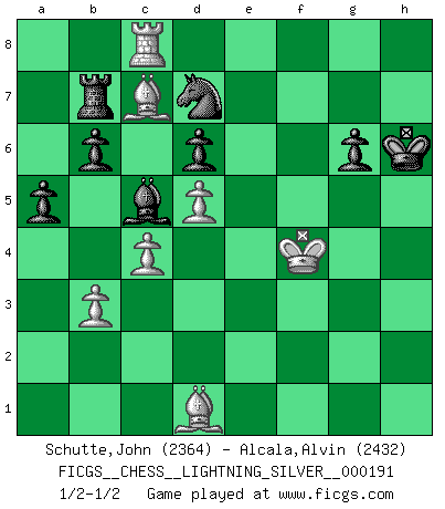 Last move : 1/2-1/2 2012 January 15 8:30:19 [Event "FICGS__CHESS__LIGHTNING_SILVER__000191"] [Site "FICGS"] [Date "2012.01.15"] [Round "1"] [White "Schutte,John"] [Black "Alcala,Alvin"] [Result "1/2-1/2"] [WhiteElo "2364"] [BlackElo "2432"] 1.e4 c5 2.Nf3 d6 3.d4 cxd4 4.Nxd4 Nf6 5.Nc3 a6 6.Be3 e5 7.Nb3 Be6 8.Be2 Be7 9.Qd3 Nbd7 10.Nd5 O-O 11.O-O Bxd5 12.exd5 Rc8 13.c4 Ne8 14.Qd2 f5 15.f4 g6 16.Rae1 Rf7 17.Qb4 exf4 18.Bxf4 Bf6 19.Nd2 a5 20.Qb5 Nc5 21.Be3 Nc7 22.Qb6 N7a6 23.Qxd8+ Rxd8 24.Nb3 Nxb3 25.axb3 Re8 26.Bd2 b6 27.Bd1 Rxe1 28.Rxe1 Be5 29.g3 Nc5 30.Bc2 Bxb2 31.Re8+ Kg7 32.Bf4 Rd7 33.Kf2 Kf7 34.Rc8 Bd4+ 35.Ke2 Na6 36.Kd2 Kf6 37.Rf8+ Ke7 38.Ra8 Nc5 39.Rc8 Be5 40.Bg5+ Bf6 41.Bf4 Bd4 42.h3 Be5 43.Bg5+ Kf7 44.g4 fxg4 45.hxg4 Rb7 46.Rc6 Nd7 47.Ke3 Nb8 48.Rc8 Bb2 49.Bd8 Ba3 50.g5 Bc5+ 51.Kf4 Nd7 52.Bc7 Kg7 53.Bd1 h6 54.gxh6+ Kxh6 1/2-1/2 Sicilian : Najdorf, Byrne (English) attack Kingside Castling by player Black (move 10) Kingside Castling by player White (move 11) This chess game ended in a draw. Follow this game move after move (download)There's never before been a Chess player with such a thorough knowledge of the intricacies of the game and such an absolutely indomitable will to win. I think Bobby is the greatest player that ever lived. (Lisa Lane) Besser ein falscher Plan, logisch durchgeführt, als gar kein Plan. (Viktor Kortschnoi) Tu no necesitas jugar muy bien, únicamente ayudar a tu oponenet a que juegue muy mal. (Genrikh Chepukaitis) Mais l'homme est une créature légère et illogique : semblable au joueur d'échecs, il n'aime que le processus du but à atteindre, non le but lui-même. (Dostoïevsky) Before all elsed, be armed. (Niccolo Machiavelli)