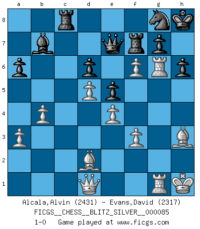 Last move : 1-0 2012 January 15 14:54:33 [Event "FICGS__CHESS__BLITZ_SILVER__000085"] [Site "FICGS"] [Date "2012.01.15"] [Round "1"] [White "Alcala,Alvin"] [Black "Evans,David"] [Result "1-0"] [WhiteElo "2431"] [BlackElo "2317"] 1.d4 Nf6 2.c4 e6 3.Nc3 Bb4 4.Nf3 b6 5.Qc2 Bb7 6.a3 Bxc3+ 7.Qxc3 O-O 8.Bg5 d6 9.Nd2 Nbd7 10.f3 h6 11.Bh4 e5 12.e4 Re8 13.d5 Rc8 14.Qc2 c6 15.Qd1 Nf8 16.Bf2 N6d7 17.g3 Rc7 18.Be2 Qg5 19.h4 Qg6 20.O-O Nf6 21.Nb1 cxd5 22.cxd5 N8d7 23.Kh2 a6 24.Nc3 b5 25.Rc1 Rec8 26.Rg1 Nh5 27.Be3 Kh8 28.Bf1 f5 29.Bh3 f4 30.gxf4 Qf6 31.f5 Qxh4 32.Rg4 Qd8 33.Qd2 Nc5 34.Rcg1 Nf6 35.Rg6 Qf8 36.Kh1 Nb3 37.Qd1 Nc5 38.b4 Na4 39.Nxa4 bxa4 40.Bd2 Rf7 41.Qxa4 Qe7 42.Qd1 Ng8 43.f6 1-0 Nimzo-Indian : Three knights variation Kingside Castling by player Black (move 7) Kingside Castling by player White (move 20) Player White won this chess game. Follow this game move after move (download)Is Bobby Fischer quite sane ? (Salo Flohr) Über die Verhaftung Bobby Fischers: Warum es die Bush-Administration für nötig befindet einen 61 Jahre alten Mann zu hetzten, der für niemanden ausser sich selbste eine Gefahr darstellt ist ein Rätsel. (Nigel Short) No hay precio que no valga la pena por la cabellera del Rey enemigo. (Koblentz) Un millionnaire : 'Monsieur Steinitz ! Vous ne participez aux tournois que pour l'argent, alors que moi je n'y viens que pour l'honneur.' Steinitz : 'Chacun joue pour ce qu'il n'a pas'... Unless I accept my faults I will most certainly doubt my virtues. (Hugh Prather)