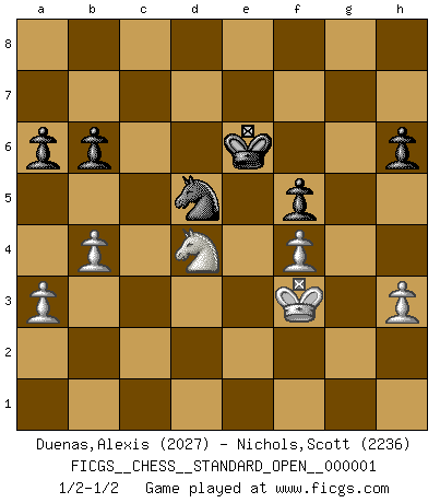 Last move : 1/2-1/2 2012 January 18 17:29:15 [Event "FICGS__CHESS__STANDARD_OPEN__000001"] [Site "FICGS"] [Date "2012.01.15"] [Round "2"] [White "Duenas,Alexis"] [Black "Nichols,Scott"] [Result "1/2-1/2"] [WhiteElo "2027"] [BlackElo "2236"] 1.d4 Nf6 2.c4 e6 3.Nc3 Bb4 4.Qc2 O-O 5.a3 Bxc3+ 6.Qxc3 b6 7.Bg5 Bb7 8.f3 h6 9.Bh4 d5 10.e3 Nbd7 11.cxd5 Nxd5 12.Bxd8 Nxc3 13.Bh4 Nd5 14.Bf2 c5 15.e4 Ne7 16.Ne2 Rac8 17.Nc3 cxd4 18.Bxd4 Rfd8 19.Rd1 Nc5 20.Bxc5 Rxd1+ 21.Kxd1 Rxc5 22.Kd2 Kf8 23.Be2 Ng6 24.Ke3 Ne5 25.Rc1 Ke7 26.b4 Rc8 27.Na2 Rxc1 28.Nxc1 g5 29.g3 f5 30.exf5 exf5 31.f4 Ng6 32.Nb3 gxf4+ 33.gxf4 Kf6 34.Bf3 Bxf3 35.Kxf3 Ne7 36.Nd4 a6 37.h3 Nd5 38.Nc6 Ke6 39.Nd4+ Kf6 40.Nc6 Ke6 41.Nd4+ 1/2-1/2 Nimzo-Indian : Classical variation Kingside Castling by player Black (move 4) This chess game ended in a draw. Follow this game move after move (download)If your opponent offers you a draw, try to work out why he thinks he's worse off. (Nigel Short) Das Zentrum ist der Balkan des Schachbretts - Kriegshandlungen können in jedem Moment ausbrechen. (Aaron Nimzowitsch) El Ajedrez es un cuento de Hadas de las 1001 metidas de pata. (Savielly Tartakower) J'ai vu le vaincu d'Echecs jouer des années durant dans l'espoir de la fête de la victoire. Car tu es plus riche de ce qu'elle existe si même elle n'est point pour toi. Ainsi de la perle du fond des mers. (Antoine de Saint-Exupéry) Humor is by far the most significant activity of the human brain. (Edward De Bono)