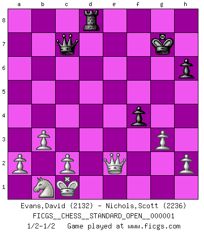 Last move : 1/2-1/2 2012 January 24 18:6:46 [Event "FICGS__CHESS__STANDARD_OPEN__000001"] [Site "FICGS"] [Date "2012.01.15"] [Round "1"] [White "Evans,David"] [Black "Nichols,Scott"] [Result "1/2-1/2"] [WhiteElo "2132"] [BlackElo "2236"] 1.e4 c5 2.Nf3 d6 3.d4 cxd4 4.Nxd4 Nf6 5.Nc3 a6 6.Bg5 e6 7.Qf3 Nc6 8.Nxc6 bxc6 9.O-O-O h6 10.Bh4 Qb6 11.Bxf6 gxf6 12.Qxf6 Rg8 13.Qf4 Rb8 14.b3 Qb4 15.Qe3 Bg7 16.Nb1 Qa5 17.Rxd6 Be5 18.Qd2 Qc7 19.Rd3 Bf4 20.Re3 Qb6 21.g3 Bxe3 22.fxe3 Qb4 23.Qf2 Qxe4 24.Bg2 Qe5 25.Rf1 f5 26.Bxc6+ Kf8 27.Rd1 Kg7 28.Bg2 Qc7 29.e4 Bb7 30.exf5 Bxg2 31.Qxg2 exf5 32.Qf1 Rgd8 33.Rxd8 Rxd8 34.Qxa6 f4 35.Qe2 1/2-1/2 Sicilian : Najdorf, 6...e6 Queenside Castling by player White (move 9) This chess game ended in a draw. Follow this game move after move (download)Many Chess players were surprised when after the game, Fischer quietly explained: 'I had already analyzed this possibility' in a position which I thought was not possible to foresee from the opening. (Mikhail Tal) Pläne sind die Träume des Verständigen. (Ernst Freiherr von Feuchtersleben) En la perfecta combinación de Ajedrez como en una historia corta de primera clase, toda la trama y contra trama deberá conducir hacia un final sorprendente, el interes no es mitigado hasta el último momento. (Yates and Winter) On a dit que l'homme se distingue de l'animal par le fait qu'il achète plus de livres qu'il ne peut en lire. Je voudrais suggérer qu'inclure à la liste des livres quelques livres d'échecs rendrait la distinction manifeste. (Edward Lasker) SEO proverb : Make your website optimized for human beings, not for search engines.