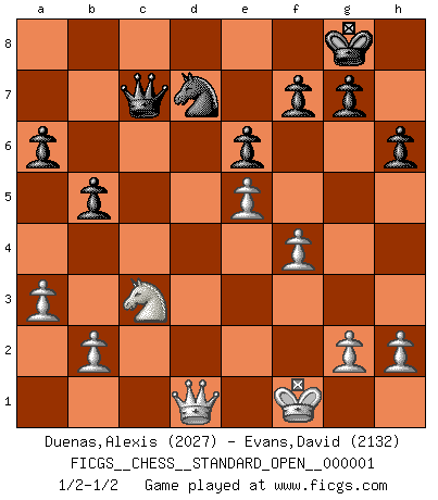 Last move : 1/2-1/2 2012 January 21 17:8:45 [Event "FICGS__CHESS__STANDARD_OPEN__000001"] [Site "FICGS"] [Date "2012.01.15"] [Round "1"] [White "Duenas,Alexis"] [Black "Evans,David"] [Result "1/2-1/2"] [WhiteElo "2027"] [BlackElo "2132"] 1.d4 Nf6 2.c4 e6 3.Nc3 d5 4.Bf4 dxc4 5.e3 a6 6.Bxc4 c5 7.Nf3 b5 8.Be2 Bb7 9.O-O Nbd7 10.Ne5 Nxe5 11.Bxe5 cxd4 12.Bxd4 Be7 13.f4 Rc8 14.Bf3 Bxf3 15.Qxf3 Bc5 16.Rad1 Bxd4 17.Rxd4 Qe7 18.a3 O-O 19.Rfd1 h6 20.e4 Rfd8 21.Rxd8+ Rxd8 22.Rxd8+ Qxd8 23.e5 Nd7 24.Qd1 Qb6+ 25.Kf1 Qc7 1/2-1/2 Queen's pawn game Kingside Castling by player White (move 9) Kingside Castling by player Black (move 18) This chess game ended in a draw. Follow this game move after move (download)If Chess is a science, it's a most inexact one. If Chess is an art, it is too exacting to be seen as one. If Chess is a sport, it's too esoteric. If Chess is a game, it's too demanding to be just a game. If Chess is a mistress, she's a demanding one. If Chess is a passion, it's a rewarding one. If Chess is life, it's a sad one. (Unknown) Mutter, ich bin eben Ex-Weltmeister geworden. --beim nach Hause Kommen nach dem Verlust des WM-Titels an Mihail Botvinnik -- (Mikhail Nekhemyevich Tal) Cuando estes solo, cuando te sientas un extraño en el mundo, juega al Ajedrez. Esto levantará tu espiritu y será tu consejero de guerra. (Aristóteles) Les réformistes prétendent que les progrès de la théorie conduiront à la disparition des échecs, et qu'il faut, pour leur rendre vie, en remanier les règles. En réalité, qu'exprime cette affirmation? Le mépris de l'intuition, de l'imagination et de tous les autres éléments qui font des échecs un art. (Alexander Alekhine) Heh, heh, heh. Time to abandon ship. (General Grievous in Star Wars ep.3)
