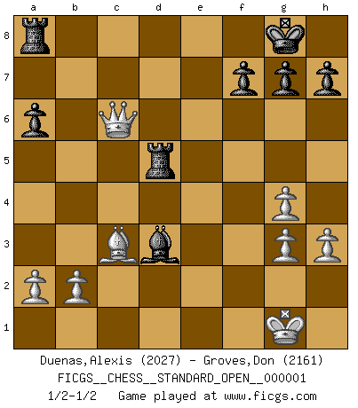Last move : 1/2-1/2 2012 February 10 6:39:3 [Event "FICGS__CHESS__STANDARD_OPEN__000001"] [Site "FICGS"] [Date "2012.01.15"] [Round "1"] [White "Duenas,Alexis"] [Black "Groves,Don"] [Result "1/2-1/2"] [WhiteElo "2027"] [BlackElo "2161"] 1.d4 d5 2.c4 c6 3.e3 Nf6 4.Nc3 Bf5 5.Nf3 e6 6.Nh4 Bg4 7.Qb3 b6 8.h3 Bh5 9.g4 Ne4 10.Nxe4 Qxh4 11.cxd5 exd5 12.Ng3 Bg6 13.Bg2 Bd6 14.e4 Bxg3 15.fxg3 Qe7 16.e5 O-O 17.O-O Na6 18.Bd2 Nc7 19.Bb4 c5 20.Ba3 Rfd8 21.Rac1 Ne6 22.dxc5 bxc5 23.Bxd5 Nd4 24.Bxc5 Qxe5 25.Rce1 Qxe1 26.Bxd4 Qd2 27.Rd1 Qxd1+ 28.Qxd1 Rxd5 29.Qa4 a6 30.Bc3 Bd3 31.Qc6 1/2-1/2 QGD Slav defense Kingside Castling by player Black (move 16) Kingside Castling by player White (move 17) This chess game ended in a draw. Follow this game move after move (download)Avoid the crowd. Do your own thinking independently. Be the Chess player, not the Chess piece. (Ralph Charell) Schach ist mein Leben, meine Leidenschaft, was ich gelernt habe und seit meinem 14. Lebensjahr profimässig praktiziere. Darauf zu verzichten, würde mir sehr schwer fallen. (Viktor Kortschnoi) Vive, pierde y aprende al observar a tu oponente como ganar. (Amber Steenbock) Ce qui est bien, c'est d'avoir tout un tas de pièces en prise : l'adversaire ne peut en prendre qu'une à la fois. Cité par Thierry Audin. Hello Thibault, if I have had a plan (and I had one, I hope), I have forgotten it during the last week... - Hello Heinz-Georg. What do you mean a plan ? (Anonymous players, during a Big Chess game)