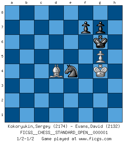 Last move : 1/2-1/2 2012 May 16 11:43:13 [Event "FICGS__CHESS__STANDARD_OPEN__000001"] [Site "FICGS"] [Date "2012.01.15"] [Round "2"] [White "Kokoryukin,Sergey"] [Black "Evans,David"] [Result "1/2-1/2"] [WhiteElo "2174"] [BlackElo "2132"] 1.d4 Nf6 2.c4 e6 3.Nc3 d5 4.Nf3 c6 5.e3 Nbd7 6.Qc2 Bd6 7.Bd3 O-O 8.O-O dxc4 9.Bxc4 b5 10.Bd3 Bb7 11.a3 a5 12.Rd1 b4 13.axb4 axb4 14.Rxa8 Qxa8 15.Ne4 Nxe4 16.Bxe4 Nf6 17.Nd2 Rc8 18.b3 c5 19.Bxb7 Qxb7 20.Nc4 cxd4 21.Rxd4 Bc5 22.Rd1 Ne4 23.Bd2 h6 24.h3 Be7 25.Be1 Nf6 26.Ra1 Nd5 27.Qa2 Nb6 28.Qa7 Qxa7 29.Rxa7 Nxc4 30.Rxe7 Ne5 31.Bxb4 Nd3 32.Rb7 Rc1+ 33.Kh2 Nxf2 34.Ba5 h5 35.b4 Ne4 36.g4 Rc2+ 37.Kg1 hxg4 38.hxg4 Rb2 39.Bd8 Nd6 40.Rb8 Kh7 41.Be7 Ne4 42.Kf1 Kg6 43.Rb7 Nf2 44.g5 Ne4 45.b5 Rb1+ 46.Kg2 Nc3 47.Kg3 Rxb5 48.Rxb5 Nxb5 49.Kf4 Nc3 50.e4 Ne2+ 51.Kf3 Nc1 52.Ba3 Nb3 53.Bb2 Nd2+ 54.Kf4 Nc4 55.Ba1 e5+ 56.Kg4 Nd2 57.Bxe5 Nxe4 58.Bd4 1/2-1/2 Queen's pawn game Kingside Castling by player Black (move 7) Kingside Castling by player White (move 8) 10 pieces endgame at move 48 : White KRBPP , Black KNPPP WHITE : King + 1 Rook 1 Bishop 2 Pawns BLACK : King + 1 Knight 3 Pawns 9 pieces endgame at move 48 : White KBPP , Black KNPPP WHITE : King + 1 Bishop 2 Pawns BLACK : King + 1 Knight 3 Pawns 8 pieces endgame at move 57 : White KBPP , Black KNPP WHITE : King + 1 Bishop 2 Pawns BLACK : King + 1 Knight 2 Pawns 7 pieces endgame at move 57 : White KBP , Black KNPP WHITE : King + 1 Bishop 1 Pawn BLACK : King + 1 Knight 2 Pawns This chess game ended in a draw. Follow this game move after move (download)I feel as if I were a piece in a game of Chess, when my opponent says of it: That piece cannot be moved. (Soren Kierkegaard) Im Blitz ist es einfacher mit einer Figur weniger anzugreifen, als sich mit einer Mehrfigur zu verteidigen. (Mikhail Nekhemyevich Tal) Si pudieramos observar el interior de la cabeza de un jugador de Ajedrez, encontraríamos ahí un mundo lleno de sentimientos, imágenes, ideas, emoción y pasión. (Alfred Binet) Les échecs sont un jeu par leur forme, un art par leur essence et une science par sa difficulté d'acquisition. Ils peuvent vous procurer autant de plaisir qu'un bon livre ou une belle musique, mais vous n'aurez une réelle joie que si vous arrivez à bien jouer. (Tigran Petrosian) The man who strikes first admits that his ideas have given out. (Chinese proverb)