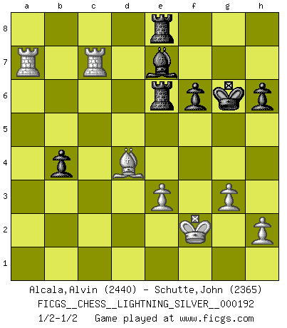 Last move : 1/2-1/2 2012 January 15 16:3:33 [Event "FICGS__CHESS__LIGHTNING_SILVER__000192"] [Site "FICGS"] [Date "2012.01.15"] [Round "1"] [White "Alcala,Alvin"] [Black "Schutte,John"] [Result "1/2-1/2"] [WhiteElo "2440"] [BlackElo "2365"] 1.d4 d5 2.c4 e6 3.Nf3 Nf6 4.g3 dxc4 5.Bg2 a6 6.Ne5 Bb4+ 7.Nc3 Nd5 8.Bd2 Nb6 9.e3 N8d7 10.O-O Nxe5 11.dxe5 O-O 12.Ne4 Be7 13.Qg4 Kh8 14.Rfd1 Qe8 15.Bc3 Nd5 16.Bd4 Rg8 17.Rac1 b5 18.b3 cxb3 19.axb3 a5 20.f4 a4 21.Ng5 h6 22.bxa4 Rxa4 23.Qh5 Rf8 24.Bxd5 exd5 25.e6 f6 26.Nf7+ Kg8 27.Qxd5 c6 28.Qxc6 Ra6 29.Qxe8 Rxe8 30.f5 Bxe6 31.fxe6 Rxe6 32.Nxh6+ gxh6 33.Rc7 b4 34.Ra1 Kh7 35.Kf2 Kg6 36.R1a7 1/2-1/2 Queen's gambit declined Kingside Castling by player White (move 10) Kingside Castling by player Black (move 11) This chess game ended in a draw. Follow this game move after move (download)I guess a certain amount of temperament is expected of Chess geniuses. (Ron Gross) Schach verlangt totale Konzentration. (Robert James Fischer) Siempre es mejor sacrificar los hombres de tu oponente. (Savielly Tartakower) Je menace de comprendre la position. (Anonyme) Thus, what is of supreme importance in war is to attack the enemy's strategy. (Sun Tzu)
