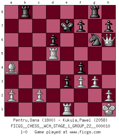 Last move : 1-0 2012 February 11 19:16:51 [Event "FICGS__CHESS__WCH_STAGE_1_GROUP_22__000010"] [Site "FICGS"] [Date "2012.01.15"] [Round "1"] [White "Pentru,Oana"] [Black "Kukula,Pawel"] [Result "1-0"] [WhiteElo "1800"] [BlackElo "2058"] 1.e4 c5 2.Nf3 Nc6 3.d4 cxd4 4.Nxd4 Nf6 5.Nc3 e5 6.Ndb5 d6 7.Bg5 a6 8.Na3 b5 9.Bxf6 gxf6 10.Nd5 f5 11.Bd3 Be6 12.O-O Bxd5 13.exd5 Ne7 14.Nxb5 Bg7 15.Nc3 e4 16.Bc4 Ng6 17.Qh5 Bxc3 18.bxc3 Qf6 19.Qh6 Qxc3 20.Bb3 Ke7 21.Rad1 a5 22.Ba4 Rab8 23.Bb3 Rhg8 24.Kh1 Qe5 25.g3 f4 26.Rfe1 a4 27.Bxa4 e3 28.f3 Qxd5 29.Rxd5 1-0 Sicilian : Pelikan (Lasker/Sveshnikov) variation Kingside Castling by player White (move 12) Player White won this chess game. Follow this game move after move (download)The most powerful weapon in Chess is to have the next move. (David Bronstein) Privat ist Kortschnoi kein schlechter Mensch, sehr sympathisch. Aber während des Spiels ist er grausam. Er will dich töten. (Miguel Najdorf) Si tu oponente te ofrece un empate, trata de averiguar porque piensa él que esta en una posición peor. (Nigel Short) Même si vous avez un bon coup à faire, regardez toujours s'il n'y en a pas un qui lui soit préférable. (Pedro Damiano) All the biggest technological inventions created by man - the airplane, the automobile, the computer - says little about his intelligence, but speaks volumes about his laziness. (Mark Kennedy)
