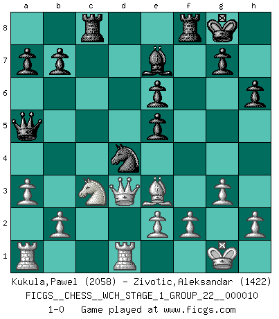 Last move : 1-0 2012 March 18 9:20:19 [Event "FICGS__CHESS__WCH_STAGE_1_GROUP_22__000010"] [Site "FICGS"] [Date "2012.01.15"] [Round "1"] [White "Kukula,Pawel"] [Black "Zivotic,Aleksandar"] [Result "1-0"] [WhiteElo "2058"] [BlackElo "1422"] 1.d4 Nf6 2.c4 e6 3.g3 d5 4.Nf3 dxc4 5.Bg2 c5 6.O-O Nc6 7.Qa4 Be7 8.dxc5 Bxc5 9.Qxc4 Be7 10.Nc3 Qa5 11.Rd1 O-O 12.a3 e5 13.Ng5 h6 14.Nge4 Nxe4 15.Bxe4 Be6 16.Bd5 Nd4 17.Bxe6 fxe6 18.Be3 Rac8 19.Qd3 1-0 This chess game has been lost on time (started : 2012.01.15 21:50:10) Catalan Opening Kingside Castling by player White (move 6) Kingside Castling by player Black (move 11) Player White won this chess game. Follow this game move after move (download)Chess is played with the mind and not with the hands ! (Renaud and Kahn) Ich verstehe Aljechins Kombinationen ganz gut; aber woher er diese Angriffschancen bekommt und wie er die Eröffnung behandelt das ist für mich ein Buch mit sieben Siegeln. (Rudolf Spielmann) No solamente yo pronostico su triunfo sobre Botvinnik, sino que me adelanto y digo que probablemente Fischer es el jugador de Ajedrez mas grande que haya existido. (John Collins) Les écrivains ont utilisé les échecs pour analyser les côtés extrêmes de la nature humaine. Dans ce cadre, les échecs offrent un champ d'expérimentation idéal. Mais on pourrait faire la même chose avec la peinture. Et là, en vous référant à Van Gogh, vous ne tirerez pas de conclusion définitive sur les peintres. (Gary Kasparov) Every now and then a man's mind is stretched by a new idea and never shrinks back to its former dimensions. (Oliver Wendell Holmes, Sr.)