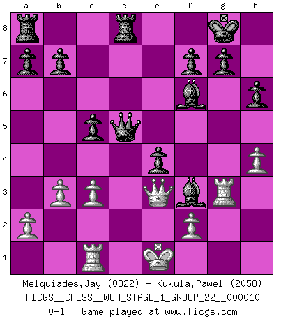 Last move : 0-1 2012 February 3 2:36:11 [Event "FICGS__CHESS__WCH_STAGE_1_GROUP_22__000010"] [Site "FICGS"] [Date "2012.01.15"] [Round "1"] [White "Melquiades,Jay"] [Black "Kukula,Pawel"] [Result "0-1"] [WhiteElo "0822"] [BlackElo "2058"] 1.e4 c5 2.Nf3 Nc6 3.c3 Nf6 4.h3 Nxe4 5.d3 Nf6 6.Bg5 h6 7.Bh4 e5 8.Nbd2 Be7 9.Ne4 Nxe4 10.dxe4 Bxh4 11.g3 Bf6 12.g4 d6 13.Bc4 Ne7 14.b3 O-O 15.h4 Bxg4 16.Rg1 Bh5 17.Qd3 d5 18.exd5 e4 19.Qe3 Bxf3 20.Rg3 Nxd5 21.Bxd5 Qxd5 22.Rc1 Rfd8 0-1 Sicilian defense Kingside Castling by player Black (move 14) Player Black won this chess game. Follow this game move after move (download)Botvinnik tried to take the mystery out of Chess, always relating it to situations in ordinary life. He used to call Chess a typical inexact problem similar to those which people are always having to solve in everyday life. (Garry Kasparov) Die Neutralität betrachte ich als eine schwere Krankheit. (Viktor Kortschnoi) La partida mas dura de ganar es una partida ganada. (Emanuel Lasker) Avant la finale, les dieux ont créé le milieu de partie. (Tarrasch) Are you threatening me, Master Jedi ? (Chancellor Palpatine in Star Wars ep.3)