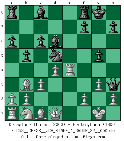 Last move : 0-1 2012 April 7 11:26:23 [Event "FICGS__CHESS__WCH_STAGE_1_GROUP_22__000010"] [Site "FICGS"] [Date "2012.02.12"] [Round "1"] [White "Delaplace,Thomas"] [Black "Pentru,Oana"] [Result "0-1"] [WhiteElo "2000"] [BlackElo "1800"] 1.e4 e5 2.Nf3 Nc6 3.Bb5 a6 4.Ba4 Nf6 5.O-O Be7 6.Re1 b5 7.Bb3 O-O 8.c3 d5 9.exd5 Nxd5 10.Nxe5 Nxe5 11.Rxe5 c6 12.d4 Bd6 13.Re1 Qh4 14.g3 Qh3 15.Re4 g5 0-1 This chess game has been lost on time (started : 2012.02.12 21:27:33) Ruy Lopez : Closed, 7...O-O Kingside Castling by player White (move 5) Kingside Castling by player Black (move 7) Player Black won this chess game. Follow this game move after move (download)Mistrust is the most necessary characteristic of the Chess player. (Siegbert Tarrasch) Im Spitzenschach von heute geht es nur um Vorbereitung, um tiefgründige, sorgfältige Eröffnungsvorbereitung. (Nigel Short) Un buen sacrificio es aquel que aunque no sea necesariamente sólido, deja a tu oponente aturdido y confuso. (Rudolph Spielmann) Dieu déplace le joueur, et celui-ci la pièce. Quel Dieu derrière Dieu commence donc la trame ? Arturo Perez-Reverte (prix de littérature policière 1993). We need strong personalities and only one world champion to attract sponsors. (Anatoly Karpov)