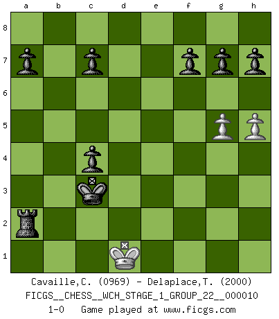 Last move : 1-0 2012 April 23 0:7:0 [Event "FICGS__CHESS__WCH_STAGE_1_GROUP_22__000010"] [Site "FICGS"] [Date "2012.02.12"] [Round "1"] [White "Cavaille,Cedric"] [Black "Delaplace,Thomas"] [Result "1-0"] [WhiteElo "0969"] [BlackElo "2000"] 1.e4 e5 2.Nf3 Nc6 3.Bc4 Nf6 4.Nc3 Nxe4 5.Nxe4 d5 6.Bxd5 Qxd5 7.d3 Bg4 8.h3 Bh5 9.g4 Bg6 10.Bd2 Bxe4 11.dxe4 Qxe4+ 12.Be3 Nd4 13.Nxd4 Qxh1+ 14.Ke2 Qxd1+ 15.Kxd1 O-O-O 16.c3 Bc5 17.b4 exd4 18.bxc5 dxe3 19.Ke2 exf2 20.Kxf2 Rhe8 21.Re1 Rxe1 22.Kxe1 Rd3 23.Kf2 Kd7 24.Ke2 Rxc3 25.Kf2 Ke6 26.Ke2 Ke5 27.Kd2 Kd4 28.c6 bxc6 29.h4 c5 30.a3 Rxa3 31.g5 Ra2+ 32.Kc1 Kc3 33.Kd1 c4 34.h5 1-0 This chess game has been lost on time (started : 2012.02.12 21:27:33) Two knights defense Queenside Castling by player Black (move 15) Player White won this chess game. Follow this game move after move (download)The most important feature of the Chess position is the activity of the pieces. This is absolutely fundamental in all phases of the game: Opening, Middlegame and especially Endgame. The primary constraint on a piece's activity is the Pawn structure. (Michael Stean) Wie kann ich Remis annehmen? Ich weiß ja gar nicht, wie ich stehe! (Fritz Sämisch) Haz el enroque temprano y seguido. (Rob Sillars) Dans le domaine de la peinture, de la gravure et de la sculpture, dès la première décennie de notre siècle, les artistes abandonnent la représentation de la partie d'échecs pour se concentrer sur les pièces, sur les échiquiers et sur toutes les variations auxquelles les unes et les autres peuvent donner lieu. On passe en quelque sorte d'un thème social à un thème musical (au sens de la musica médiévale, c'est-à-dire d'une notion qui inclue le rythme, l'harmonie, la construction et la déconstruction, etc.). Graphiquement et picturalement, l'échiquier apparaît comme une structure ouverte, dynamique, d'une richesse infinie, autorisant toutes les combinatoires et débouchant sur des mouvements et des rythmes de nature exponentielle. (Michel Pastoureau) Don't anthropomorphize computers - they hate it. (Anonymous)