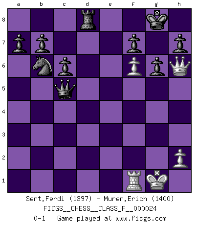 Last move : 0-1 2007 February 3 16:5:42 [Event "FICGS__CHESS__CLASS_F__000024"] [Site "FICGS"] [Date "2007.01.15"] [Round "1"] [White "Sert,Ferdi"] [Black "Murer,Erich"] [Result "0-1"] [WhiteElo "1397"] [BlackElo "1400"] 1.d4 Nf6 2.c4 e6 3.Nc3 d5 4.Nf3 Be7 5.Bg5 O-O 6.cxd5 exd5 7.e3 Nbd7 8.Bd3 c6 9.O-O Re8 10.a3 Ne4 11.Nxe4 dxe4 12.Bxe4 Bxg5 13.Bf5 g6 14.Nxg5 Qxg5 15.Bh3 Nb6 16.f4 Qb5 17.Bxc8 Raxc8 18.f5 Rxe3 19.f6 Qxb2 20.Qg4 Rd8 21.Rad1 Rxa3 22.Qg5 Ra2 23.Rd3 Rxd4 24.Re3 Rd8 25.Rb3 Qxb3 26.Qh6 Rxg2+ 27.Kxg2 Qd5+ 28.Kg1 Qc5+ 0-1 Queen's pawn game Kingside Castling by player Black (move 5) Kingside Castling by player White (move 9) Player Black won this chess game. Follow this game move after move (download)Via the squares on the chessboard, the Indians explain the movement of time and the age, the higher influences which control the world and the ties which link Chess with the human soul. (Al-Masudi) Matt entspricht nicht immer den Tatsachen. (Savielly Grigorievitsch Tartakower) No nos podemos resistir a la fascinación de un sacrificio ya que la pasión por los sacrificios es parte de la naturaleza de un jugador de Ajedrez. (Rudolf Spielman) Tout change constamment, y compris dans le monde des Echecs. (Botvinnik) You have to believe in yourself. (Sun Tzu)
