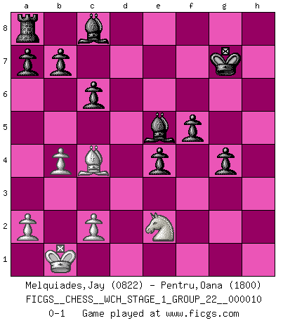 Last move : 0-1 2012 February 1 21:33:4 [Event "FICGS__CHESS__WCH_STAGE_1_GROUP_22__000010"] [Site "FICGS"] [Date "2012.01.15"] [Round "1"] [White "Melquiades,Jay"] [Black "Pentru,Oana"] [Result "0-1"] [WhiteElo "0822"] [BlackElo "1800"] 1.e4 e6 2.Nf3 d5 3.d4 dxe4 4.Ne5 Nf6 5.Nc3 Be7 6.Bg5 h6 7.Bxf6 gxf6 8.Nxf7 Kxf7 9.Qh5+ Kf8 10.O-O-O f5 11.Bc4 Nc6 12.Ne2 Bd6 13.g4 Qg5+ 14.Qxg5 hxg5 15.d5 Ne5 16.Bd3 Nxg4 17.Bc4 Nxf2 18.Rhf1 Nxd1 19.Rxd1 exd5 20.Rxd5 Rxh2 21.Nc3 Bf4+ 22.Kb1 Rh1+ 23.Rd1 Rxd1+ 24.Nxd1 Kg7 25.Nc3 c6 26.b4 g4 27.Ne2 Be5 0-1 French defense Queenside Castling by player White (move 10) Player Black won this chess game. Follow this game move after move (download)The boy (then a 12 year old boy named Anatoly Karpov) doesn't have a clue about Chess, and there's no future at all for him in this profession. (Mikhail Botvinnik) Jeder Fehler erscheint unglaublich dumm, wenn andre ihn begehen. (Georg Christoph Lichtenberg) Al jugar al Ajedrez entonces, podemos aprender: Primero: Previsión... Segundo: Prudencia... Tercero: Cautela... Y al final, aprendemos del Ajedrez el hábito de no ser desanimados por apariencias malas presentes en el estado de nuestros asuntos, el hábito de la esperanza por una oportunidad favorable y la perseveración de los secretos de los recursos. (Benjamin Franklin) Toutes choses étant égales, c'est la conviction qui gagne. Alliée à une volonté de vaincre, elle sert de détonateur, suscite des idées, disperse les doutes et aide à penser clairement. (Robert Fischer) Internet: Absolute communication, absolute isolation. (Paul Carvel)