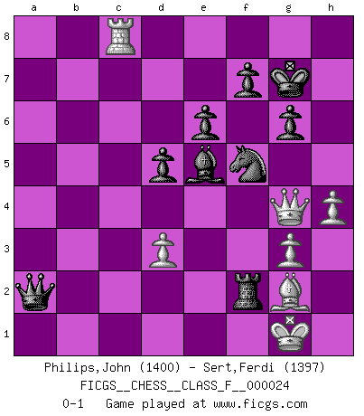 Last move : 0-1 2007 June 1 11:46:59 [Event "FICGS__CHESS__CLASS_F__000024"] [Site "FICGS"] [Date "2007.01.15"] [Round "1"] [White "Philips,John"] [Black "Sert,Ferdi"] [Result "0-1"] [WhiteElo "1400"] [BlackElo "1397"] 1.c4 c5 2.Nc3 Nf6 3.e4 d6 4.Nge2 g6 5.g3 Bg7 6.Bg2 Nc6 7.O-O O-O 8.d3 a6 9.Bg5 Rb8 10.Nf4 b5 11.cxb5 axb5 12.a3 h6 13.Bxf6 Bxf6 14.Ncd5 Bxb2 15.Ra2 Bg7 16.Ne3 Nd4 17.a4 bxa4 18.Rxa4 Be6 19.Nfd5 Bxd5 20.Nxd5 e6 21.Ne3 Ra8 22.Rxa8 Qxa8 23.e5 d5 24.Ng4 Qa2 25.Re1 Rb8 26.h3 Rb2 27.Rf1 Nf5 28.Qf3 Re2 29.Rc1 h5 30.Rxc5 hxg4 31.Qxg4 Bxe5 32.Rc8+ Kg7 33.h4 Rxf2 0-1 English : Symmetrical variation Kingside Castling by player White (move 7) Kingside Castling by player Black (move 7) Player Black won this chess game. Follow this game move after move (download)The enormous mental resilience, without which no Chess player can exist, was so much taken up by Chess that he could never free his mind of this game. (Albert Einstein) Mein erstes Ziel war nicht, die Partie zu gewinnen, sondern eine Figur zu opfern. -- der junge (Wilhelm Steinitz) Fischer era un maestro de claridad y un Rey del posicionamiento astuto. Sus oponentes podían ver hacia donde se dirigía pero eran impotentes para detenerlo. (Bruce Pandolfini) Votre seul travail dans les ouvertures est d'obtenir un milieu de partie jouable. (Lajos Portish) Imagination is more important than knowledge. Knowledge is limited. Imagination encircles the world. (Albert Einstein)