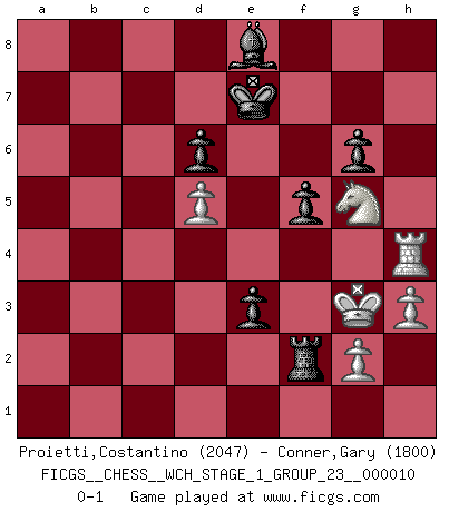 Last move : 0-1 2012 March 27 21:8:19 [Event "FICGS__CHESS__WCH_STAGE_1_GROUP_23__000010"] [Site "FICGS"] [Date "2012.01.15"] [Round "1"] [White "Proietti,Costantino"] [Black "Conner,Gary"] [Result "0-1"] [WhiteElo "2047"] [BlackElo "1800"] 1.e4 e5 2.Nf3 Nc6 3.Bb5 a6 4.Ba4 Nf6 5.O-O Be7 6.Re1 b5 7.Bb3 d6 8.c3 O-O 9.h3 h6 10.d4 Re8 11.Nbd2 Bf8 12.Nf1 Bd7 13.Ng3 Na5 14.Bc2 c5 15.d5 Nc4 16.Nh2 Nb6 17.Nhf1 a5 18.Ne3 g6 19.b3 a4 20.b4 Qc7 21.Rb1 Bg7 22.bxc5 Qxc5 23.Bd2 h5 24.Bd3 a3 25.Qe2 Rab8 26.Ngf1 Na4 27.Rb3 Qc7 28.Rxa3 Nc5 29.Kh1 Nfxe4 30.Bxe4 Nxe4 31.Nc2 Nxd2 32.Nxd2 Ra8 33.c4 Rec8 34.Rxa8 Rxa8 35.a3 bxc4 36.Qxc4 Qa5 37.Nb4 Bb5 38.Qb3 Qxa3 39.Qxa3 Rxa3 40.Ne4 Bf8 41.Rb1 Ba4 42.Nc6 f5 43.Nf6+ Kf7 44.Rb8 Be7 45.Nxe7 Kxe7 46.Nh7 Rd3 47.Rg8 Be8 48.Kg1 Rd1+ 49.Kh2 h4 50.Rh8 e4 51.Ng5 Rf1 52.Rxh4 Rxf2 53.Kg3 e3 0-1 Comment by player 1 : Costantino Proietti : Comgratulation! Unlucky game! I sent the wrong move 29. Rh1?? (I should play 4 moves later!!) instead 29. f3, so immediately my position collapsed. Ruy Lopez : Closed Kingside Castling by player White (move 5) Kingside Castling by player Black (move 8) Player Black won this chess game. Follow this game move after move (download)Play the opening like a book, the middle game like a magician, and the endgame like a machine. (Spielmann) Moralische Siege zählen nicht. (Savielly Grigorievitsch Tartakower) ¿Cual es el objetivo de jugar una apertura de gambito?... Para adquirir una reputación de ser un jugador apuesto a costo de perder el juego. (Siegbert Tarrasch) Nous vivons dans un monde échiquéen : chaque jour qui passe est un défi à relever. (Philosophe Sasha) You know what they say : You lie down with the Devil, you wake up in Hell. (Horatio Caine, C.S.I. Miami)