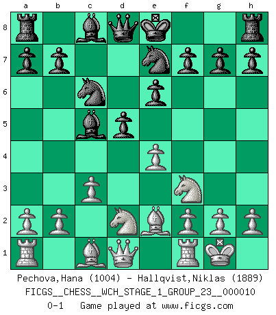 Last move : 0-1 2012 April 3 11:1:7 [Event "FICGS__CHESS__WCH_STAGE_1_GROUP_23__000010"] [Site "FICGS"] [Date "2012.01.15"] [Round "1"] [White "Pechova,Hana"] [Black "Hallqvist,Niklas"] [Result "0-1"] [WhiteElo "1004"] [BlackElo "1889"] 1.e4 e6 2.d4 d5 3.Nd2 Be7 4.Bd3 Nc6 5.Ngf3 Nb4 6.Be2 c5 7.c3 Nc6 8.dxc5 Bxc5 9.O-O Nge7 0-1 This chess game has been lost on time (started : 2012.01.15 21:50:12) French : Tarrasch Kingside Castling by player White (move 9) Player Black won this chess game. Follow this game move after move (download)Every Pawn is a potential Queen. (James Mason) Schach ist Kampf, hauptsächlich jedoch gegen die eigenen Fehler. (Savielly Grigorievitsch Tartakower) Sin errores no puede haber brillantez. (Emanuel Lasker) 'L'échange des dames est un coup dur pour les deux adversaires...' Un journaliste lors d'une partie du match Spassky-Fischer Empty your mind, be formless, shapeless — like water. (Bruce Lee)