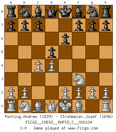 Last move : 1-0 2012 February 5 17:57:8 [Event "FICGS__CHESS__RAPID_C__000104"] [Site "FICGS"] [Date "2012.01.16"] [Round "1"] [White "Ponting,Andrew"] [Black "Strohmeier,Josef"] [Result "1-0"] [WhiteElo "1539"] [BlackElo "1696"] 1.d4 d5 2.c4 e6 3.Nf3 1-0 Queen's gambit declined Player White won this chess game. Follow this game move after move (download)Chess is the art of analysis. (Mikhail Botvinnik) Wir irren allesamt, nur jeder irrt anders. (Georg Christoph Lichtenberg) Después de la respuesta de las negras a 1.e4 con 1..e5, se quedan siempre tratando de entrar dentro del juego. (Howard Staunton) La guerre est enfant de la passion, la passion est enfant du narcissisme et le narcissisme est l'enfant. (...) Une autre partie ? (Thibault de Vassal) Lamb in skin of tiger, still fears the wolf. (Chinese proverb)