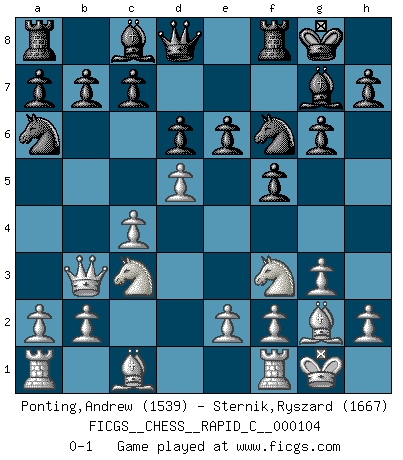 Last move : 0-1 2012 February 29 19:59:9 [Event "FICGS__CHESS__RAPID_C__000104"] [Site "FICGS"] [Date "2012.01.16"] [Round "1"] [White "Ponting,Andrew"] [Black "Sternik,Ryszard"] [Result "0-1"] [WhiteElo "1539"] [BlackElo "1667"] 1.d4 f5 2.g3 Nf6 3.Bg2 g6 4.c4 e6 5.Nc3 Bg7 6.Nf3 d6 7.O-O O-O 8.Qc2 Nc6 9.d5 Nb4 10.Qb3 Na6 0-1 This chess game has been lost on time (started : 2012.01.16 0:12:32) Dutch defense Kingside Castling by player White (move 7) Kingside Castling by player Black (move 7) Player Black won this chess game. Follow this game move after move (download)The King is a fighting piece. Use it ! (Wilhelm Steinitz) Der zweitbeste Zug ist oft der einzig richtige. (Savielly Grigorievitsch Tartakower) Yo no creo en la psicología. Yo creo en las buenas movidas. (Bobby Fischer) Seul un grand joueur sait à quel point il joue faiblement. (Xavier Tartacover) Before all elsed, be armed. (Niccolo Machiavelli)