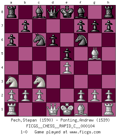Last move : 1-0 2012 May 9 0:59:20 [Event "FICGS__CHESS__RAPID_C__000104"] [Site "FICGS"] [Date "2012.01.16"] [Round "1"] [White "Pech,Stepan"] [Black "Ponting,Andrew"] [Result "1-0"] [WhiteElo "1590"] [BlackElo "1539"] 1.e4 c5 2.Nf3 Nc6 3.d4 cxd4 4.Nxd4 Nf6 5.Nc3 e5 6.Ndb5 d6 7.Bg5 a6 8.Na3 1-0 This chess game has been lost on time (started : 2012.01.16 0:12:32) Sicilian : Pelikan (Lasker/Sveshnikov) variation Player White won this chess game. Follow this game move after move (download)Chess is above all, a fight ! (Emanuel Lasker) Das Schach ist nichts für kleine Geister, es beansprucht einen vollen Mann, der sich nicht sklavisch an das Überlieferte hält, sondern selbständig die Tiefen des Spiels zu ergründen sucht. (Wilhelm Steinitz) Yo considero que Fischer es uno de los expertos mas grandes de aperturas de siempre. (Keith Hayward) Celui qui prend des risques peut perdre, celui qui n'en prend pas perd toujours. (Xavier Tartacover) Have no fear of perfection - you'll never reach it. (Salvador Dali)