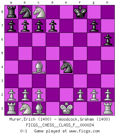 Last move : 0-1 2007 May 19 16:6:44 [Event "FICGS__CHESS__CLASS_F__000024"] [Site "FICGS"] [Date "2007.01.15"] [Round "1"] [White "Murer,Erich"] [Black "Woodcock,Graham"] [Result "0-1"] [WhiteElo "1400"] [BlackElo "1400"] 1.e4 e5 2.Nf3 Bd6 3.d4 f6 4.dxe5 fxe5 5.Bc4 h6 6.Nxe5 Qe7 7.Qh5+ Kd8 8.Nf7+ Ke8 9.Nxh8 Kd8 10.Nf7+ Ke8 11.Nxd6+ Kf8 12.Qf5+ Nf6 13.Nxc8 Qxe4+ 14.Qxe4 Nxe4 0-1 King's knight Opening Player Black won this chess game. Follow this game move after move (download)Fischer is the strongest player in the world. In fact, the strongest player who ever lived. (Larry Evans) Alles was am Schachbrett zählt sind gute Züge. (Robert James Fischer) La belleza de un movimiento no se refleja solo en su apariencia, sino en el pensamiento detrás de él. (Siegbert Tarrasch) Un journaliste : 'Vous préférez avoir une dame de plus sur l'échiquier ou au lit ?' Boris Spassky : 'Ca dépend de la position.' Question: Is 'This statement is paradoxical' a paradoxical statement ? Or is it a meta-paradox ? (Normajean Yates)