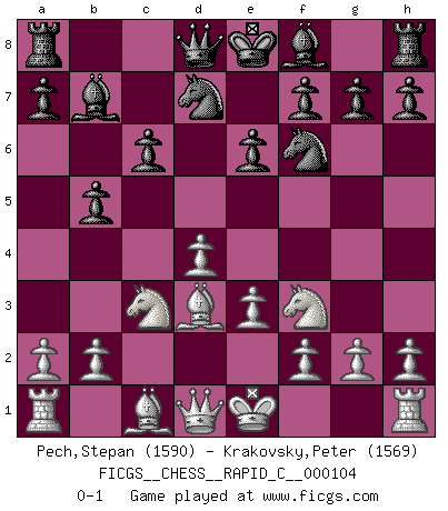 Last move : 0-1 2012 April 20 23:54:50 [Event "FICGS__CHESS__RAPID_C__000104"] [Site "FICGS"] [Date "2012.01.16"] [Round "1"] [White "Pech,Stepan"] [Black "Krakovsky,Peter"] [Result "0-1"] [WhiteElo "1590"] [BlackElo "1569"] 1.d4 d5 2.c4 c6 3.Nf3 Nf6 4.Nc3 e6 5.e3 Nbd7 6.Bd3 dxc4 7.Bxc4 b5 8.Bd3 Bb7 0-1 This chess game has been lost on time (started : 2012.01.16 0:12:32) QGD Slav : 4.Nc3 Player Black won this chess game. Follow this game move after move (download)The battle for the ultimate truth will never be won. And that's why Chess is so fascinating. (Hans Kmoch) Ich glaube, ich kenne inzwischen die Gründe für mein Versagen: schachliche Charakterfehler. Ich war nie ein Wunderkind und in meiner gesamten menschlichen Entwicklung immer zu langsam. (Viktor Kortschnoi) Si el ingenio solamente fuese necesario para lucirse, las mujeres serían las mejores jugadoras de Ajedrez del mundo. (Albin) La victoire dans une partie d'Echecs appartient la plupart du temps à celui qui voit un peu plus loin que l'adversaire. (Lasker) A good book on your shelf is a friend that turns its back on you and remains a friend. (Author unknown)