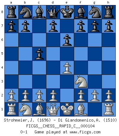 Last move : 0-1 2012 February 5 17:57:41 [Event "FICGS__CHESS__RAPID_C__000104"] [Site "FICGS"] [Date "2012.01.16"] [Round "1"] [White "Strohmeier,Josef"] [Black "Di Giandomenico,Alfonso"] [Result "0-1"] [WhiteElo "1696"] [BlackElo "1510"] 1.e4 c5 2.Nf3 e6 0-1 Sicilian defense Player Black won this chess game. Follow this game move after move (download)Fischer Chess play was always razor-sharp, rational and brilliant. One of the best ever. (Dave Regis) Mit sehr nachdenklichem Gesicht schreitet Bobby durch den Turniersaal. Was ist passiert?, fragt Lombardy. Ich stehe schlecht, antwortet Fischer. Lombardy: Dann biete doch einfach Remis an. Fischer: So schlecht stehe ich nun auch wieder nicht! (Robert James Fischer) La táctica fluye a partir de una posición superior. (Bobby Fischer) Avec des compensations pour le matériel en plus... (Anonyme) First of all, we have to go back to the classical time control. (Anatoly Karpov)