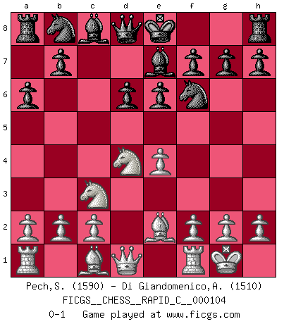 Last move : 0-1 2012 April 20 11:50:22 [Event "FICGS__CHESS__RAPID_C__000104"] [Site "FICGS"] [Date "2012.01.16"] [Round "1"] [White "Pech,Stepan"] [Black "Di Giandomenico,Alfonso"] [Result "0-1"] [WhiteElo "1590"] [BlackElo "1510"] 1.e4 c5 2.Nc3 e6 3.Nf3 d6 4.d4 cxd4 5.Nxd4 a6 6.Be2 Nf6 7.O-O Be7 0-1 This chess game has been lost on time (started : 2012.01.16 0:12:32) Sicilian : Closed Kingside Castling by player White (move 7) Player Black won this chess game. Follow this game move after move (download)I won't play with you anymore. You have insulted my friend. - When an opponent cursed himself for a blunder. (Miguel Najdorf) Es tut gut, die Entwicklungsperiode von, [...] demokratischem Geist durchdringen zu lassen. Wie undemokratisch wäre es doch beispielsweise, den einen Offizier große Spaziertouren vornehmen zu lassen, während die anderen zu Hause säßen und sich entsetzlich langweilten. (Aaron Nimzowitsch) La vida es como el Ajedrez, con lucha, competición y eventos buenos y malos. (Benjamin Franklin) Que feriez-vous si vous étiez en train de jouer aux échecs et que la fin du monde arrive ? Je continuerais à jouer. (Saint Borromée) Depression is just anger without enthusiasm. (Unknown)