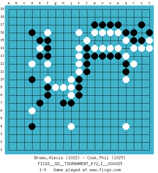 Last move : 1-0 2012 March 27 22:40:15 [Event "FICGS__GO__TOURNAMENT_KYU_I__000039"] [Site "FICGS"] [Date "2012.01.16"] [Round "1"] [Black "Bromo,Alexis"] [White "Cook,Phil"] [Result "1-0"] [Rating 1 "1022"] [Rating 2 "1029"] 1.k10 q10 2.d16 q4 3.d4 k16 4.q16 j4 5.d10 d6 6.e7 e14 7.e15 f16 8.f15 p16 9.p17 o16 10.o17 n16 11.n17 m16 12.m17 l15 13.f13 f10 14.f9 f12 15.f14 d12 16.e13 g9 17.f8 j8 18.h7 h9 19.j7 j10 20.k9 j9 21.k8 k11 22.l11 k12 23.l12 k13 24.l13 k14 25.l14 m14 26.m13 n14 27.n13 o14 28.o13 p14 29.p13 q15 30.r16 r14 31.r15 s14 32.s15 t15 33.t16 t14 34.s17 q13 35.q12 r12 36.q11 1-0 This go game has been lost on time (started : 2012.01.16 7:52:57) Here are the names of the openings (joseki) played in the four corners : Corner d4 : d4 j4 Hoshi (Hwajeom, Seongjeom, Xingwei`) 4-4 Point. The star or hoshi (4-4) point, emphasizing influence at the potential expense of territory. Corner d16 : d16 e14 Hoshi (Hwajeom, Seongjeom, Xingwei`) 4-4 Point. The star or hoshi (4-4) point, emphasizing influence at the potential expense of territory. Corner q16 : q16 p16 Hoshi (Hwajeom, Seongjeom, Xingwei`) 4-4 Point. The star or hoshi (4-4) point, emphasizing influence at the potential expense of territory. Player Black won this Go (weiqi, baduk) game. Follow this game move after move (download)While the Baroque rules of chess could only have been created by humans, the rules of go are so elegant, organic, and rigorously logical that if intelligent life forms exist elsewhere in the universe, they almost certainly play go. (Edward Lasker, international chess master) There are two types of people in this world, good and bad. The good sleep better, but the bad seem to enjoy the waking hours much more. (Woody Allen)