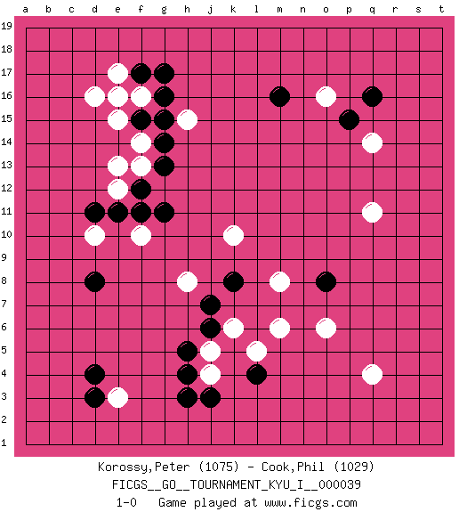 Last move : 1-0 2012 February 29 21:15:25 [Event "FICGS__GO__TOURNAMENT_KYU_I__000039"] [Site "FICGS"] [Date "2012.01.16"] [Round "1"] [Black "Korossy,Peter"] [White "Cook,Phil"] [Result "1-0"] [Rating 1 "1075"] [Rating 2 "1029"] 1.q16 q4 2.d4 d16 3.f17 e3 4.d3 f16 5.g16 e17 6.f15 e16 7.g17 q11 8.h3 j4 9.h4 d10 10.d8 o16 11.m16 q14 12.p15 h8 13.k8 m8 14.o8 k10 15.j6 k6 16.j7 o6 17.l4 j5 18.h5 l5 19.j3 m6 20.e11 e13 21.f12 f13 22.g13 f14 23.g14 h15 24.g15 e12 25.d11 e15 26.g11 f10 27.f11 1-0 Here are the names of the openings (joseki) played in the four corners : Corner d16 : d16 f17 Hoshi (Hwajeom, Seongjeom, Xingwei`) 4-4 Point. The star or hoshi (4-4) point, emphasizing influence at the potential expense of territory. Ikken Kakari (Hankan Keolch'im, Yi Gua`jiao~, 1-Space Low Approach). Black 2 is the standard approach move to the 4-4. Corner d4 : d4 e3 Hoshi (Hwajeom, Seongjeom, Xingwei`) 4-4 Point. The star or hoshi (4-4) point, emphasizing influence at the potential expense of territory. Corner q16 : q16 q11 Hoshi (Hwajeom, Seongjeom, Xingwei`) 4-4 Point. The star or hoshi (4-4) point, emphasizing influence at the potential expense of territory. Player Black won this Go (weiqi, baduk) game. Follow this game move after move (download)A few moments to learn, a lifetime to master. (Ancient proverb) Whoever said the pen is mightier than the sword obviously never encountered automatic weapons. (US General Douglas MacArthur)