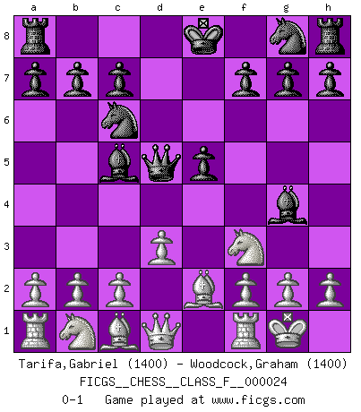 Last move : 0-1 2007 March 2 0:13:3 [Event "FICGS__CHESS__CLASS_F__000024"] [Site "FICGS"] [Date "2007.01.15"] [Round "1"] [White "Tarifa,Gabriel"] [Black "Woodcock,Graham"] [Result "0-1"] [WhiteElo "1400"] [BlackElo "1400"] 1.e4 e5 2.Nf3 d5 3.d3 Bg4 4.Be2 Bc5 5.O-O Nc6 6.exd5 Qxd5 0-1 This chess game has been lost on time (started : 2007.01.15 16:51:17) QP counter-gambit (elephant gambit) Kingside Castling by player White (move 5) Player Black won this chess game. Follow this game move after move (download)I feel as if I were a piece in a game of Chess, when my opponent says of it: That piece cannot be moved. (Soren Kierkegaard) Im Blitz ist es einfacher mit einer Figur weniger anzugreifen, als sich mit einer Mehrfigur zu verteidigen. (Mikhail Nekhemyevich Tal) La caracteristica mas importante en la posición del Ajedrez es la actividad de las piezas. Esto es absolutamente fundamental en todas las fases del juego: Apertura, Juego Medio y especialmente Finales. La limitación primordial en la actividad de una pieza, es la estructuración de los Peones. (Michael Stean) Pour moi, les échecs ne sont pas un jeu mais un art. (Alexandre Alekhine) He is a liar. I just don't know what the lie is yet. (Horatio Caine, C.S.I. Miami)