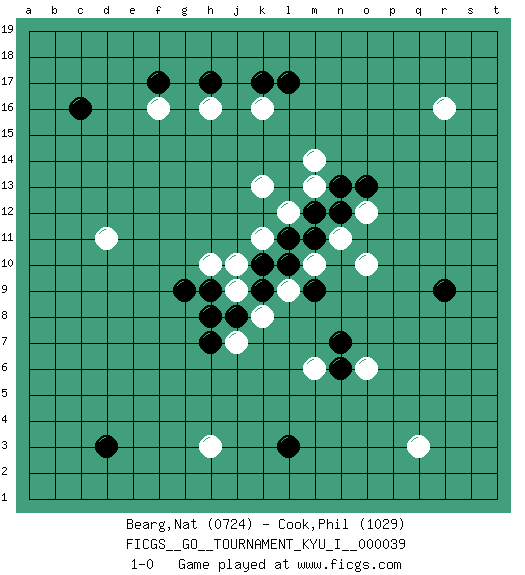 Last move : 1-0 2012 February 18 19:59:36 [Event "FICGS__GO__TOURNAMENT_KYU_I__000039"] [Site "FICGS"] [Date "2012.01.16"] [Round "1"] [Black "Bearg,Nat"] [White "Cook,Phil"] [Result "1-0"] [Rating 1 "0724"] [Rating 2 "1029"] 1.d3 q3 2.c16 r16 3.k10 j9 4.r9 d11 5.k17 k13 6.l3 h3 7.o13 o6 8.n6 m6 9.n7 k16 10.l17 f16 11.f17 h16 12.h17 o10 13.h9 j10 14.j8 h10 15.g9 k11 16.k9 j7 17.h7 k8 18.h8 l9 19.l10 m10 20.l11 l12 21.m11 n11 22.m12 m13 23.n12 o12 24.n13 m14 25.m9 1-0 Here are the names of the openings (joseki) played in the four corners : Corner d4 : d3 j9 Komoku (Somok, Xiao~mu`) 3-4 Point. The komoku (3-4) point is the traditional corner enclosure move.. Corner q4 : q3 r9 Komoku (Somok, Xiao~mu`) 3-4 Point. The komoku (3-4) point is the traditional corner enclosure move.. Corner d16 : c16 d11 Komoku (Somok, Xiao~mu`) 3-4 Point. The komoku (3-4) point is the traditional corner enclosure move.. Corner q16 : r16 o13 Komoku (Somok, Xiao~mu`) 3-4 Point. The komoku (3-4) point is the traditional corner enclosure move.. Player Black won this Go (weiqi, baduk) game. Follow this game move after move (download)Win the early ko to win the game. (Anonymous) The production of too many useful things results in too many useless people. (Karl Marx)