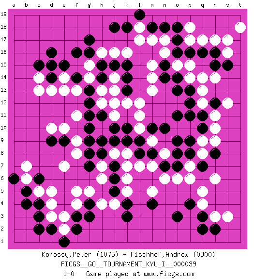 Last move : 1-0 2012 May 27 11:57:27 [Event "FICGS__GO__TOURNAMENT_KYU_I__000039"] [Site "FICGS"] [Date "2012.01.16"] [Round "1"] [Black "Korossy,Peter"] [White "Fischhof,Andrew"] [Result "1-0"] [Rating 1 "1075"] [Rating 2 "0900"] 1.q16 d4 2.d16 q4 3.o3 r6 4.q3 r3 5.p4 q5 6.q2 r14 7.r12 p14 8.o16 r10 9.r8 q12 10.q10 r11 11.q11 s12 12.p12 q13 13.r2 s3 14.k4 d10 15.g17 c14 16.d14 d13 17.c15 e14 18.d15 c13 19.f3 f4 20.g4 f5 21.c3 d3 22.c4 c5 23.b5 b6 24.c6 d5 25.b4 b7 26.d2 e2 27.c2 g5 28.f2 e3 29.e1 h4 30.g3 e7 31.k10 q9 32.p9 q8 33.p8 p7 34.o7 p10 35.p11 o10 36.q7 r9 37.o11 p6 38.n10 k16 39.k14 n17 40.o17 m15 41.k18 g15 42.f16 g14 43.g10 k6 44.j6 k5 45.j5 k7 46.l8 j4 47.k3 o6 48.n7 n6 49.j7 j8 50.g7 h7 51.h8 h6 52.j9 k8 53.k9 m7 54.o9 r17 55.r16 q17 56.o18 p17 57.p16 s16 58.s15 s17 59.r15 t18 60.n18 m17 61.n14 o15 62.n15 m14 63.o14 p15 64.p13 q14 65.j15 j16 66.h15 h16 67.g16 n16 68.m18 l17 69.j18 l18 70.l19 m13 71.o13 k12 72.j12 j13 73.k13 j14 74.k15 l12 75.h14 h13 76.g13 h12 77.g12 j11 78.f14 f13 79.h11 j12 80.e15 e13 81.g8 n8 82.o8 m9 83.m10 l10 84.l9 l11 85.m8 l7 86.j10 p18 87.m4 m5 88.e9 e10 89.d9 f9 90.g9 f8 91.a6 h10 92.h9 f11 93.g11 1-0 Here are the names of the openings (joseki) played in the four corners : Corner q4 : q4 o3 Hoshi (Hwajeom, Seongjeom, Xingwei`) 4-4 Point. The star or hoshi (4-4) point, emphasizing influence at the potential expense of territory. Ikken Kakari (Hankan Keolch'im, Yi Gua`jiao~, 1-Space Low Approach). Black 2 is the standard approach move to the 4-4. Corner q16 : q16 r14 Hoshi (Hwajeom, Seongjeom, Xingwei`) 4-4 Point. The star or hoshi (4-4) point, emphasizing influence at the potential expense of territory. Ikken Kakari (Hankan Keolch'im, Yi Gua`jiao~, 1-Space Low Approach). White 2 is the standard approach move to the 4-4. Corner d4 : d4 f3 Hoshi (Hwajeom, Seongjeom, Xingwei`) 4-4 Point. The star or hoshi (4-4) point, emphasizing influence at the potential expense of territory. Ikken Kakari (Hankan Keolch'im, Yi Gua`jiao~, 1-Space Low Approach). Black 2 is the standard approach move to the 4-4. Player Black won this Go (weiqi, baduk) game. Follow this game move after move (download)Do not make moves that strengthen your opponent ! (Anonymous) If you are going through hell, keep going. (Winston Churchill)
