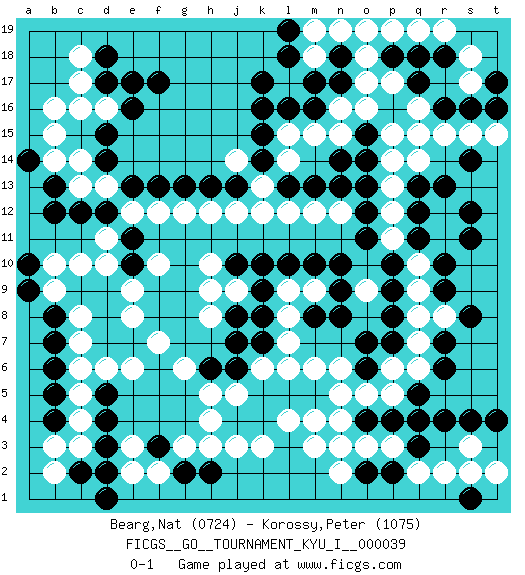 Last move : 0-1 2012 September 4 23:54:5 [Event "FICGS__GO__TOURNAMENT_KYU_I__000039"] [Site "FICGS"] [Date "2012.01.16"] [Round "1"] [Black "Bearg,Nat"] [White "Korossy,Peter"] [Result "0-1"] [Rating 1 "0724"] [Rating 2 "1075"] 1.d3 c5 2.q17 d16 3.r4 p3 4.k10 r15 5.d17 c17 6.e17 c18 7.f17 d13 8.d12 c10 9.c9 d10 10.e10 e12 11.c12 c13 12.b12 b10 13.b13 b14 14.e11 d11 15.e13 f12 16.d14 c14 17.a14 b15 18.d9 b9 19.b8 c8 20.b7 c7 21.b6 c6 22.a9 e9 23.d8 e8 24.d7 e6 25.a10 f10 26.e7 f7 27.k4 m3 28.r10 r12 29.k17 r8 30.r6 r2 31.o6 q10 32.r9 q9 33.s8 k6 34.j6 j5 35.k5 h5 36.f3 b3 37.b5 c4 38.b4 c3 39.d4 l6 40.h6 g6 41.d5 d6 42.j7 h3 43.l5 m6 44.m5 n6 45.n5 o5 46.o4 p5 47.p4 p6 48.o7 l8 49.m8 l9 50.l10 m9 51.n8 q4 52.q5 n4 53.q3 o3 54.q4 q7 55.r7 q8 56.p7 q6 57.n10 k3 58.j4 h4 59.p2 q2 60.n9 j3 61.o2 n3 62.n14 l14 63.k14 k13 64.j13 j14 65.k15 j12 66.h13 l12 67.k7 l7 68.m10 h12 69.g13 g12 70.f13 l15 71.k16 n16 72.n17 o17 73.n18 o16 74.r16 q15 75.q11 p11 76.p10 r11 77.q12 p12 78.q13 l4 79.p9 m4 80.r13 p13 81.s12 q14 82.s11 o18 83.m16 m15 84.n13 r19 85.r18 q19 86.p18 p19 87.p16 p15 88.o15 n15 89.o14 p14 90.p8 n5 91.s14 s15 92.s16 t15 93.t16 s18 94.q18 s17 95.t17 p17 96.o11 o9 97.c2 b2 98.d1 e2 99.d2 f2 100.g2 g3 101.h2 e3 102.k8 j9 103.k9 h8 104.j10 h10 105.o12 m12 106.m13 n12 107.o13 q16 108.d15 b16 109.e16 c16 110.d18 s3 111.s4 t2 112.s1 s2 113.t4 n2 114.l13 k12 115.l16 m18 116.m17 n19 117.l18 m19 118.l19 o19 119.j8 h9 0-1 Here are the names of the openings (joseki) played in the four corners : Corner d4 : d3 c5 Komoku (Somok, Xiao~mu`) 3-4 Point. The komoku (3-4) point is the traditional corner enclosure move.. Ikken Kakari (Hankan Keolch'im, Yi Gua`jiao~, 1-Space Low Pincer). The small knight move is the basic approach move to the 3-4 point stone. It has been continually used for over four centuries. There are limitless variations, with new moves constantly being discovered. White 2 opens the door to a treaure store of joseki. Corner q4 : r4 p3 Komoku (Somok, Xiao~mu`) 3-4 Point. The komoku (3-4) point is the traditional corner enclosure move.. Ikken Kakari (Hankan Keolch'im, Yi Gua`jiao~, 1-Space Low Pincer). The small knight move is the basic approach move to the 3-4 point stone. It has been continually used for over four centuries. There are limitless variations, with new moves constantly being discovered. White 2 opens the door to a treaure store of joseki. Corner q16 : q17 r15 Komoku (Somok, Xiao~mu`) 3-4 Point. The komoku (3-4) point is the traditional corner enclosure move.. Ikken Kakari (Hankan Keolch'im, Yi Gua`jiao~, 1-Space Low Pincer). The small knight move is the basic approach move to the 3-4 point stone. It has been continually used for over four centuries. There are limitless variations, with new moves constantly being discovered. White 2 opens the door to a treaure store of joseki. Corner d16 : d16 d17 Hoshi (Hwajeom, Seongjeom, Xingwei`) 4-4 Point. The star or hoshi (4-4) point, emphasizing influence at the potential expense of territory. Player White won this Go (weiqi, baduk) game. Follow this game move after move (download)Attach to the strongest stone in a pincer. (Anonymous) Secret operations are essential in war; upon them the army relies to make its every move. (Sun Tzu)