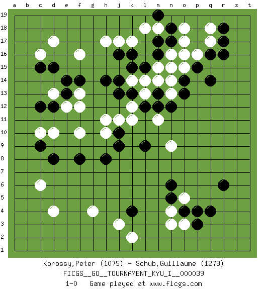 Last move : 1-0 2012 February 7 13:57:25 [Event "FICGS__GO__TOURNAMENT_KYU_I__000039 "] [Site "FICGS"] [Date "2012.01.16"] [Round "1"] [Black "Korossy,Peter "] [White "Schub,Guillaume "] [Result "1-0"] [Rating 1 "1075"] [Rating 2 "1278"] 1.q16 d4 2.q4 d17 3.c15 f16 4.c12 c16 5.d15 o3 6.o4 n4 7.p3 o5 8.p4 n3 9.r6 o17 10.m16 o15 11.q14 q18 12.r17 l18 13.j16 h17 14.m17 m18 15.o16 p16 16.n17 n16 17.n18 j17 18.k16 m15 19.l15 m14 20.k13 q17 21.r16 o18 22.m19 k17 23.o13 d10 24.d8 f10 25.f8 c6 26.c9 c10 27.f14 e12 28.e13 d13 29.d12 f13 30.e14 f12 31.h14 h11 32.h8 k11 33.j10 j11 34.l9 m11 35.m13 h10 36.j9 n9 37.k4 g4 38.n5 k2 39.n6 j3 40.p15 n14 41.o14 n13 42.n12 l13 43.m12 l14 44.l12 k14 45.j14 o16 46.k15 n15 47.r18 k12 48.j13 1-0 Here are the names of the openings (joseki) played in the four corners : Corner d16 : d17 c15Komoku (Somok, Xiao~mu`) 3-4 Point. The komoku (3-4) point is the traditional corner enclosure move..Ikken Kakari (Hankan Keolch'im, Yi Gua`jiao~, 1-Space Low Pincer). The small knight move is the basic approach move to the 3-4 point stone. It has been continually used for over four centuries. There are limitless variations, with new moves constantly being discovered. Black 2 opens the door to a treaure store of joseki. Corner q4 : q4 o3Hoshi (Hwajeom, Seongjeom, Xingwei`) 4-4 Point. The star or hoshi (4-4) point, emphasizing influence at the potential expense of territory.Ikken Kakari (Hankan Keolch'im, Yi Gua`jiao~, 1-Space Low Approach). White 2 is the standard approach move to the 4-4. Corner q16 : q16 o17Hoshi (Hwajeom, Seongjeom, Xingwei`) 4-4 Point. The star or hoshi (4-4) point, emphasizing influence at the potential expense of territory.Ikken Kakari (Hankan Keolch'im, Yi Gua`jiao~, 1-Space Low Approach). White 2 is the standard approach move to the 4-4. Corner d4 : d4 d8Hoshi (Hwajeom, Seongjeom, Xingwei`) 4-4 Point. The star or hoshi (4-4) point, emphasizing influence at the potential expense of territory. Player Black won this Go (weiqi, baduk) game.Follow this game move after move (download ) Don't make a play adjacent to a cutting-point. (Anonymous) Mandala - that's it! 16x16 squares as multiple of the four and the eight because of the Four Noble Truths and the Noble Eightfold Path. (Heinz-Georg Lehnhoff about Big Chess)