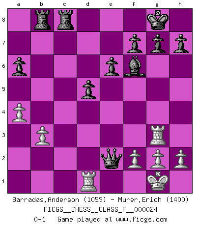 Last move : 0-1 2007 February 5 15:45:23 [Event "FICGS__CHESS__CLASS_F__000024"] [Site "FICGS"] [Date "2007.01.15"] [Round "1"] [White "Barradas,Anderson"] [Black "Murer,Erich"] [Result "0-1"] [WhiteElo "1059"] [BlackElo "1400"] 1.e4 c5 2.Nf3 Nc6 3.d4 cxd4 4.Nxd4 Nf6 5.Nc3 d6 6.Bg5 e6 7.Bb5 Bd7 8.O-O Be7 9.Nxc6 bxc6 10.Bc4 d5 11.exd5 cxd5 12.Bb5 Rb8 13.a4 a6 14.Bxd7+ Qxd7 15.b3 O-O 16.Re1 Qc7 17.Qd3 Rfc8 18.Re3 Ng4 19.Rg3 Bxg5 20.Rxg4 Bf6 21.Rd1 Qxc3 22.Qe2 Qxc2 23.Rg3 Qxe2 0-1 Sicilian defense Kingside Castling by player White (move 8) Kingside Castling by player Black (move 15) Player Black won this chess game. Follow this game move after move (download)It is no time to be playing Chess when the house is on fire. (Italian Proverb) Alle Schachspieler sollten auch ein Hobby haben. (Savielly Grigorievitsch Tartakower) Me siento como si fuera una pieza en una partida de Ajedrez, cuando mi oponente me indica: esa pieza no puede ser movida. (Soren Kierkegaard) Ce qui caractérise les parties de combat, c'est que si le défenseur a constamment de difficiles problèmes à résoudre, l'attaquant doit chercher sans relâche de nouvelles possibilités d'attaque. (Koblentz) I've lost money so fast in these clubs it's left me reeling. I've read every poker book ever written, but the only way to get better at the game is to go out and play with people who are really good. The problem is, you stand to lose a lot of money doing it. (Matt Damon)